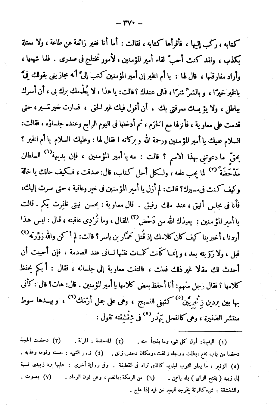 كتابه، ركب إليها، فأقرأها كتابه، فقالت: أما أنا فغير زائغة عن طاعة، ولا معتلة بكذب، ولقد كنت أحب لقاء أمير المؤمنين، لأمور تختلج في صدري، فلما شيعها، وأراد مفارقتها، قال لها: يا أم الخير إن أمير المؤمنين كتب إلي أنه مجازيني بقولك في بالخير خيرًا، وبالشر شرًّا، فما لي عندك؟ قالت: يا هذا، لا يطمعك برك بي، أن أسرك بباطل، ولا يؤيسك معرفتي بك، أن أقول فيك غير الحق، فسارت خير مسير، حتى قدمت على معاوية، فأنزلها مع الحرم، ثم أدخلها في اليوم الرابع وعنده جلساؤه، فقالت: السلام عليك يا أمير المؤمنين ورحمة الله وبركاته! فقال لها: وعليك السلام يا أم الخير؟ بحق ما دعوتني بهذا الاسم؟ قالت: مه يا أمير المؤمنين، فإن بديهة1 السلطان مدحضة2 لما يجب علمه، ولكل أحل كتاب، قال: صدقت، فكيف حالك يا خالة، وكيف كنت في مسيرك؟ قالت: لم أزل يا أمير المؤمنين في خير وعافية، حتى صرت إليك، فأنا في مجلس أنيق، عند ملك رفيق. قال معاوية: بحسن نيتي ظفرت بكم. قالت: يا أمير المؤمنين، يعيذك الله من دحض3 المقال، وما تردي عاقبته، قال: ليس هذا أردنا، أخبرينا كيف كان كلامك إذ قتل عمار بن ياسر؟ قالت: لم أكن والله زورته4 قبل، ولا رويته بعد، وإنما كانت كلمات نفثها لساني عند الصدمة، فإن أحببت أن أحدث لك مقالًا غير ذلك فعلت، فالتفت معاوية إلى جلسائه، فقال: أيكم يحفظ كلامها؟ فقال رجل منهم: أنا أحفظ بعض كلامها يا أمير المؤمنين. قال: هات؟ قال: كأني بها بين بردين زئبريين5 كثيفي النسيج، وهي على جمل أرمك6، وبيدها سوط منتشر الضفيرة، وهي كالفحل يهدر7 في شقشقته تقول: