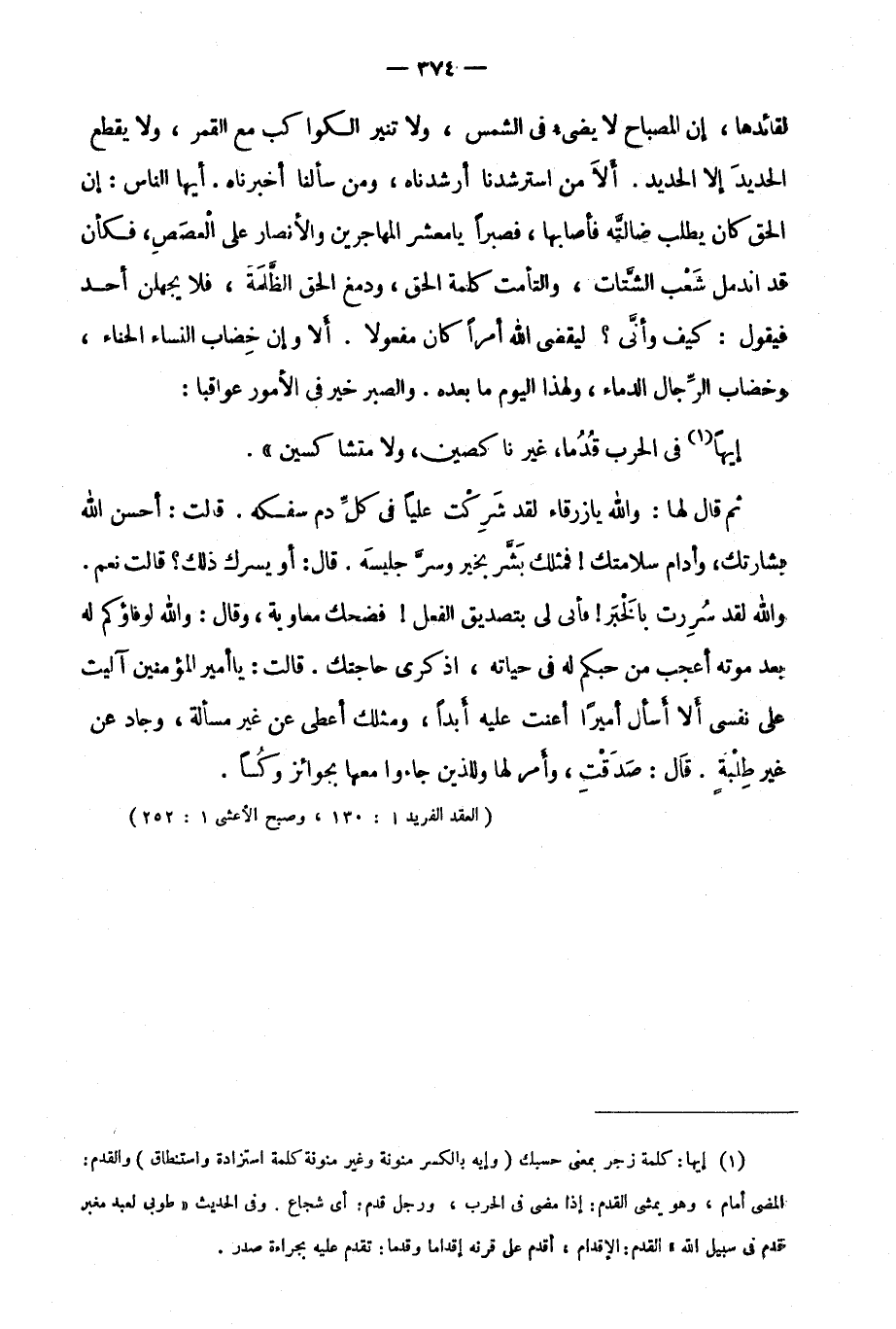 لقائدها، إن المصباح لا يضيء في الشمس، ولا تنير الكواكب مع القمر، ولا يقطع الحديد إلا الحديد. ألا من استرشدنا أرشدناه، ومن سألنا أخبرناه. أيها الناس: إن الحق كان يطلب ضالته فأصابها، فصبرًا يا معشر المهاجرين والأنصار على العصص، فكأن قد اندمل شعب الشتات، والتأمت كلمة الحق، ودمغ الحق الظلمة، فلا يجهلن أحد فيقول: كيف، وأنى؟ ليقضي الله أمرًا كان مفعولًا، ألا وإن خضاب النساء الحناء، وخضاب الرجال الدماء، ولهذا اليوم ما بعده، والصبر خير في الأمور عواقبا: