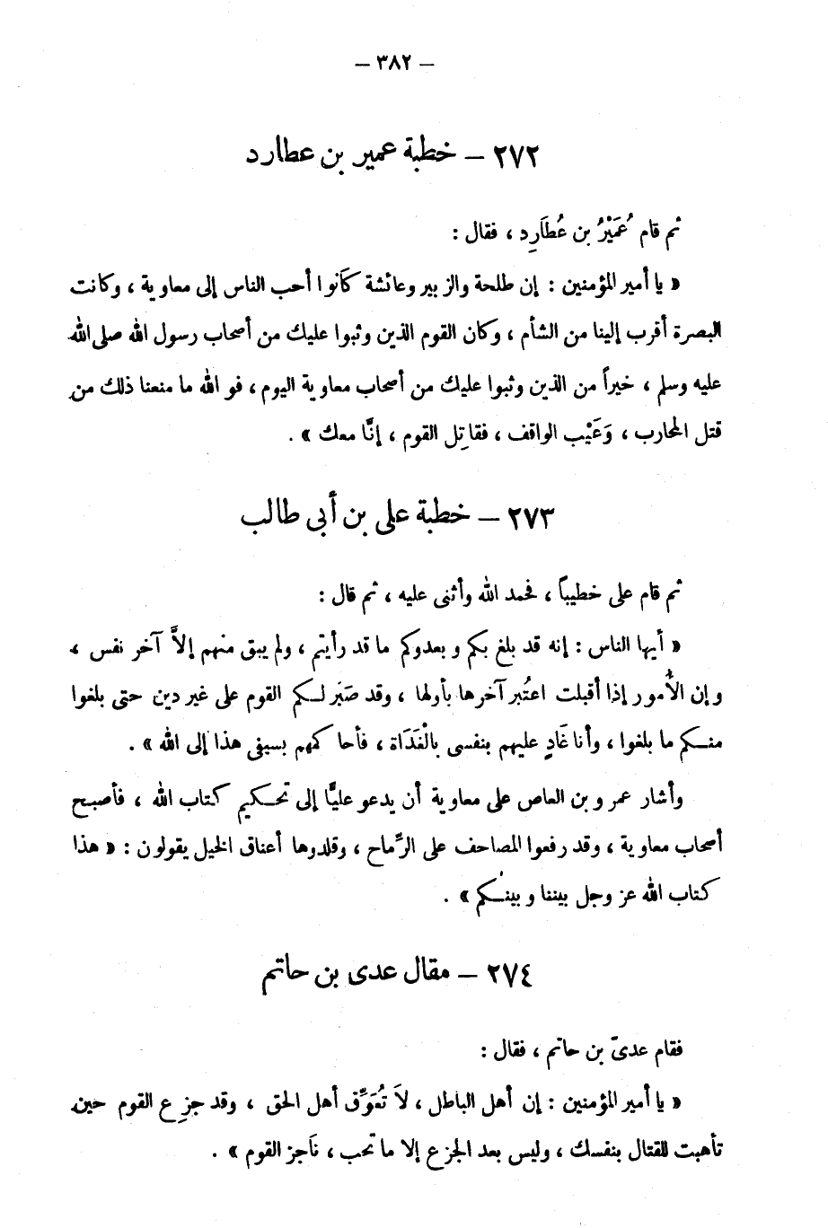 "أيها الناس: إنه قد بلغ بكم وبعدوكم ما قد رأيتم، ولم يبق منهم إلا آخر نفس، وإن الأمور إذا أقبلت اعتبر آخرها بأولها، وقد صبر لكم القوم على غير دين حتى بلغوا منكم ما بلغوا، وأنا غاد عليهم بنفسي بالغداة، فأحاكمهم بسيفي هذا إلى الله".
