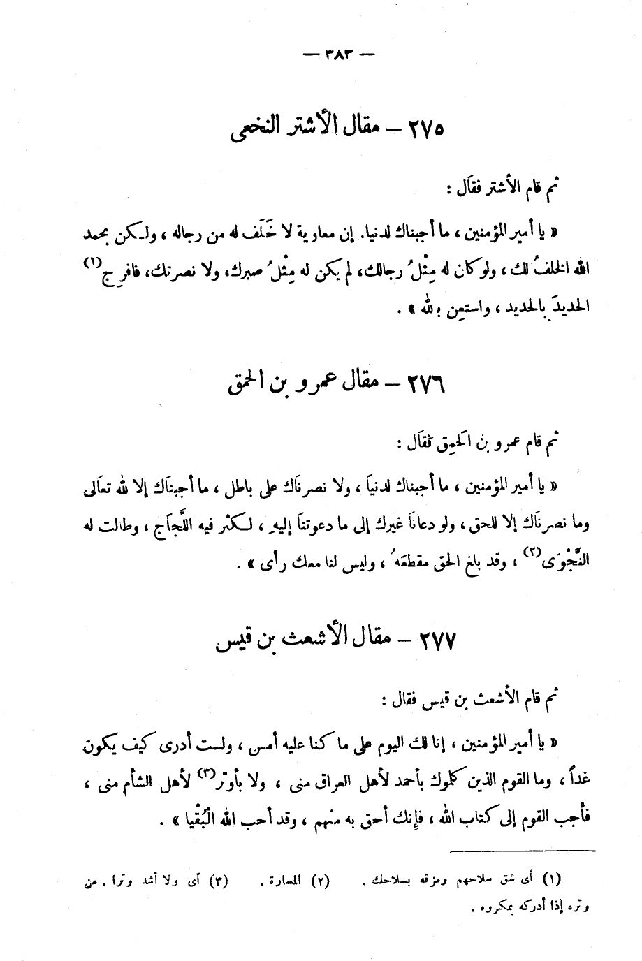 "يا أمير المؤمنين، إنا لك اليوم على ما كنا عليه أمس، ولست أدري كيف يكون غدًا، وما القوم الذين كلموك بأحمد لأهل العراق مني، ولا بأوتر1 لأهل الشأم مني، فأجب القوم إلى كتاب الله، فإنك أحق به منهم، وقد أحب الله البقيا".