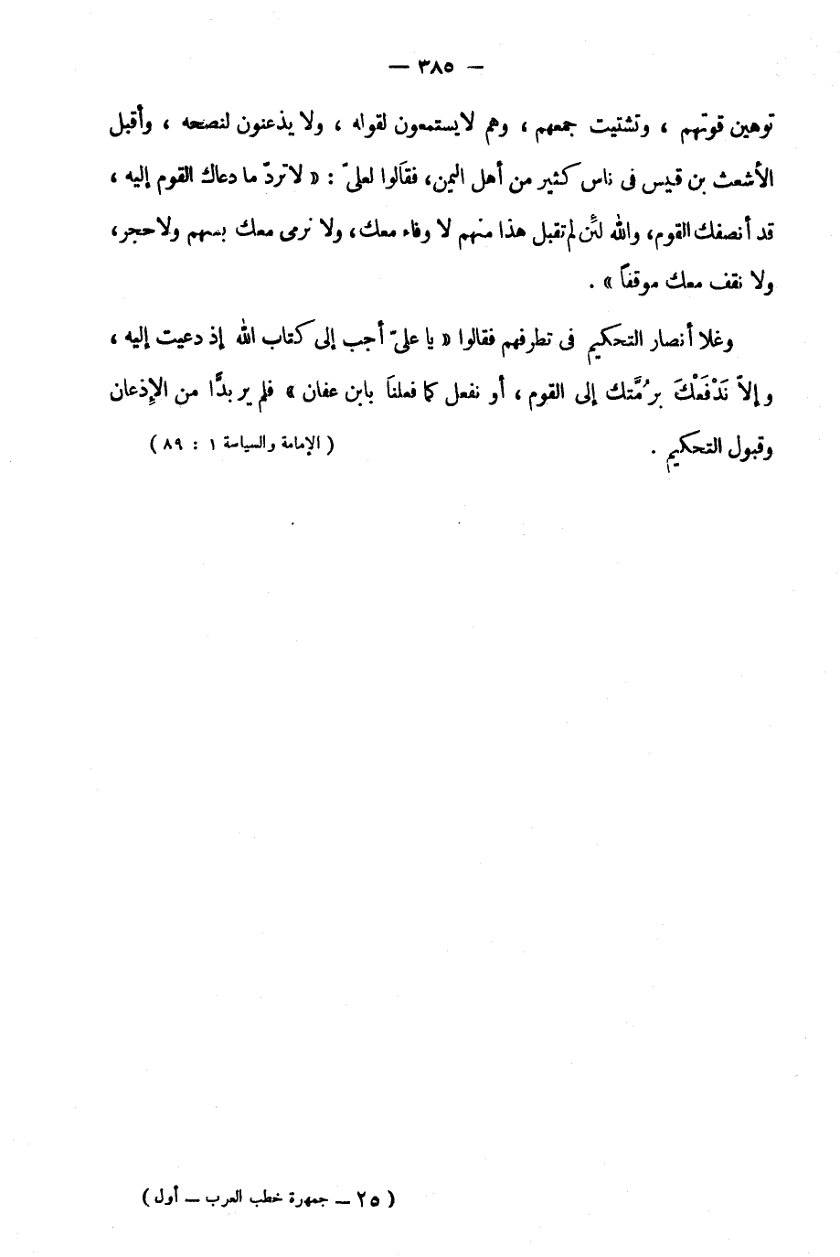 وغلا أنصار التحكيم في تطرفهم فقالوا "يا علي أجب إلى كتاب الله إذ دعيت إليه، وإلا ندفعك برمتك إلى القوم، أو نفعل كما فعلنا بابن عفان" فلم ير بدًّا من الإذعان وقبول التحكيم.