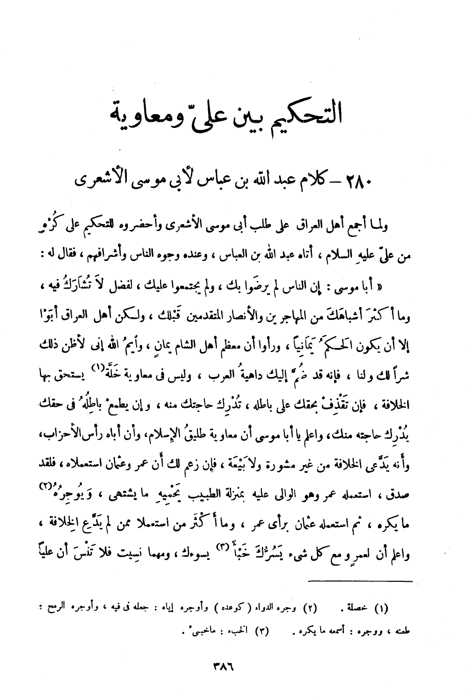 "أبا موسى: إن الناس لم يرضوا بك، ولم يجتمعوا عليك، لفضل لا تشارك فيه، وما أكثر أشباهك من المهاجرين والأنصار المتقدمين قبلك، ولكن أهل العراق أبوا إلا أن يكون الحكم يمانيًا، ورأوا أن معظم أهل الشام يمان، وايم الله إني لأظن ذلك شرًا لك ولنا، فإنه قد ضم إليك داهية العرب، وليس في معاوية خلة1 يستحق بها الخلافة، فإن نقذف بحقك على باطله، تدرك حاجتك منه، وإن يطمع باطله في حقك يدرك حاجته منك، واعلم يا أبا موسى أن معاوية طليق الإسلام، وأن أباه رأس الأحزاب، وأنه يدعي الخلافة من غير مشورة ولا بيعة، فإن زعم لك أن عمر وعثمان استعملاه، فلقد صدق، استعمله عمر وهو الوالي عليه بمنزلة الطبيب يحميه ما يشتهي، ويوجره2 ما يكره، ثم استعمله عثمان برأي عمر، وما أكثر من استعملا ممن لم يدع الخلافة، واعلم أن لعمرو مع كل شيء يسرك خبأً3 يسوءك، ومهما نسيت فلا تنس أن عليًا