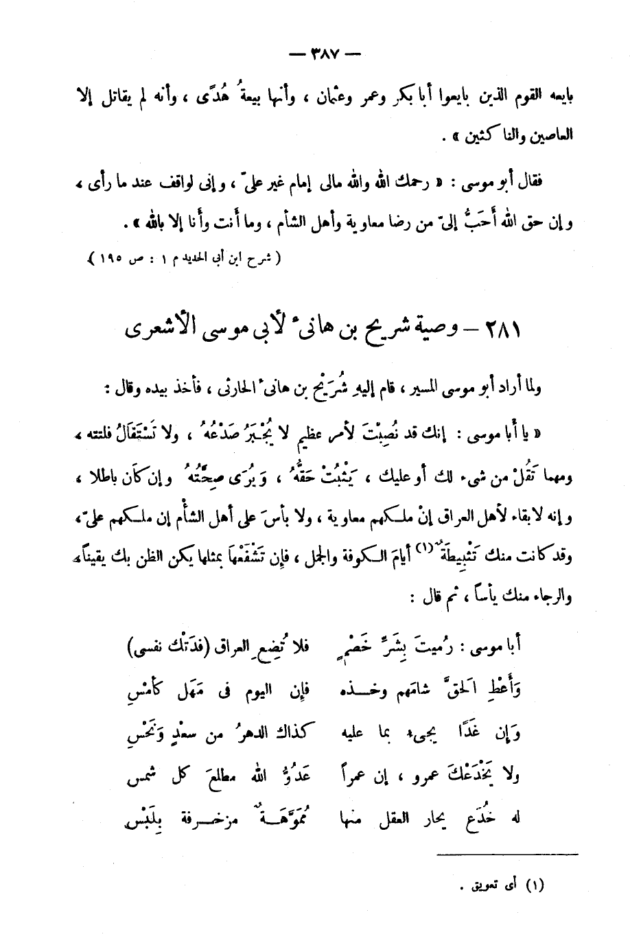 281- وصية شريح بن هانئ لأبي موسى الأشعري: