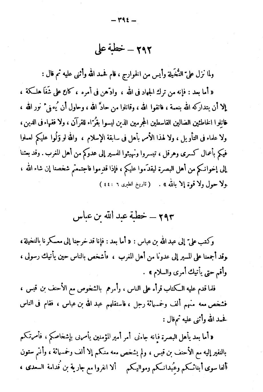 "أما بعد يأهل البصرة فإنه جاءني أمر أمير المؤمنين يأمرني بإشخاصكم، فأمرتكم بالنفير إليه مع الأحنف بن قيس، ولم يشخص معه منكم إلا ألف وخمسمائة، وأنتم ستوت ألفًا سوى أبنائكم وعبدانكم وموالكيم ألا انفروا مع جارية بن قدامة السعدي،