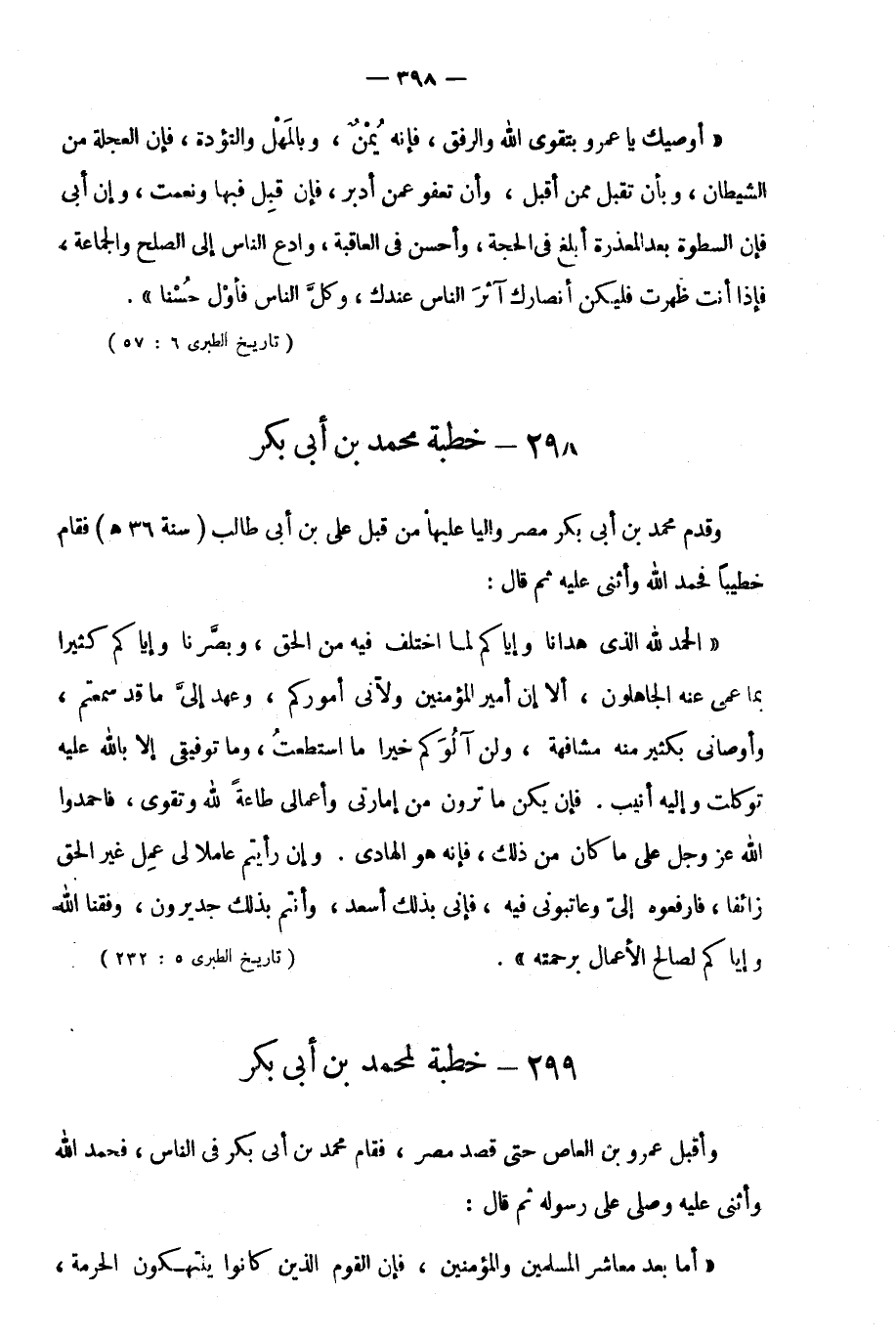 وقدم محمد بن أبي بكر مصر واليًا عليها من قبل علي بن أبي طالب "سنة 36هـ" فقام خطيبًا، فحمد الله، وأثنى عليه، ثم قال: