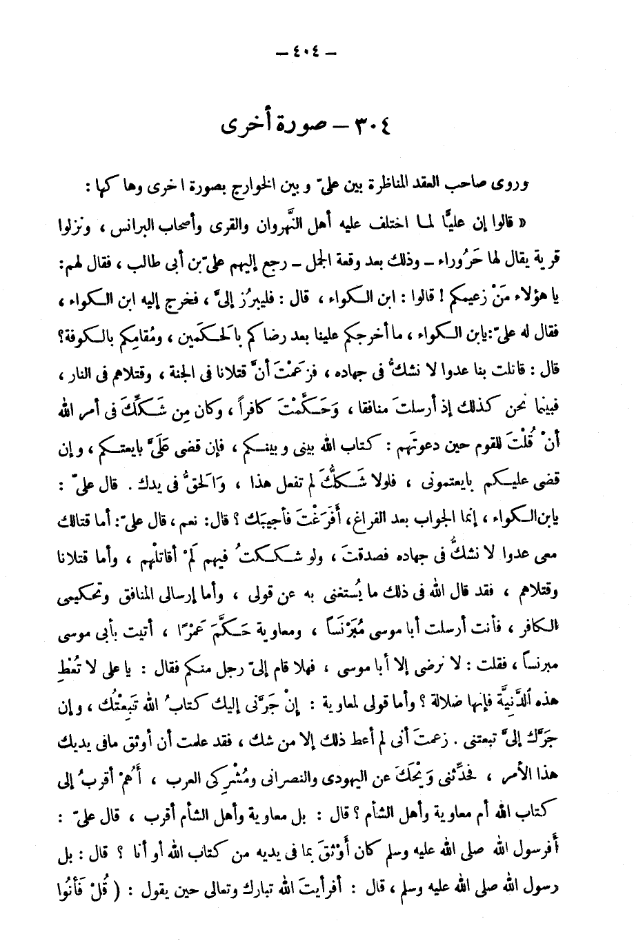 "قالوا: إن عليًأ لما اختلف عليه أهل النهروان والقرى وأصحاب البرانس، ونزلوا قرية يقال لها حروراء -وذلك بعد وقعة الجمل- رجع إليهم علي بن أبي طالب، فقال لهم: يا هؤلاء من زعيمكم! قالوا: ابن الكواء، قال: فليبرز إلي، فخرج إليه ابن الكواء، فقال له علي: يابن الكواء، ما أخرجكم علينا بعد رضاكم بالحكمين، ومقامكم بالكوفة؟ قال: قاتلت بنا عدوا لا نشك في جهاده، فزعمت أن قتلانا في الجنة، وقتلاهم في النار، فبينما نحن كذلك إذ أرسلت منافقًا، وحكمت كافرًا، وكان من شكك في أمر الله أن قلت للقوم حين دعوتهم: كتاب الله بيني وبينكم، فإن قضى علي بايعتكم، وإن قضى عليكم بايعتموني، فلولا شكك لم تفعل هذا، والحق في يدك. قال علي: يابن الكواء، إنما الجواب بعد الفراغ، أفرغت فأجيبك؟ قال: نعم، قال علي: أما قتالك معي عدوا لا نشك في جهاده فصدقت، ولو شككت فيهم لم أقاتلهم، وأما قتلانا وقتلاهم، فقد قال الله في ذلك ما يستغنى به عن قولي، وأما إرسالي المنافق وتحكيمي الكافر، فأنت أرسلت أبا موسى مبرنسًا، ومعاوية حكم عمرًا، أتيت بأبي موسى مبرنسًا، فقلت: لا نرضى إلا أبا موسى، فهلا قام إلي رجل منكم فقال: يا علي لا تعط هذه الدنية؛ فإنها ضلالة؟ وأما قولي لمعاوية: إن جرني إليك كتاب الله تبعتك، وإن جرك إلي تبعتني. زعمت أني لم أعطَ ذلك إلا من شك، فقد علمت أن أوثق ما في يديك هذا الأمر، فحدثني ويحك عن اليهودي والنصراني ومشركي العرب، أهم أقرب إلى كتاب الله أم معاوية وأهل الشأم؟ قال: بل معاوية وأهل الشأم أقرب، قال علي: أفرسول الله صلى الله عليه وسلم كان أوثق بما في يديه من كتاب الله أو أنا؟ قال: بل رسول الله صلى الله عليه وسلم، قال: أفرأيت الله تبارك وتعالى حين يقول: {قُلْ فَأْتُوا}