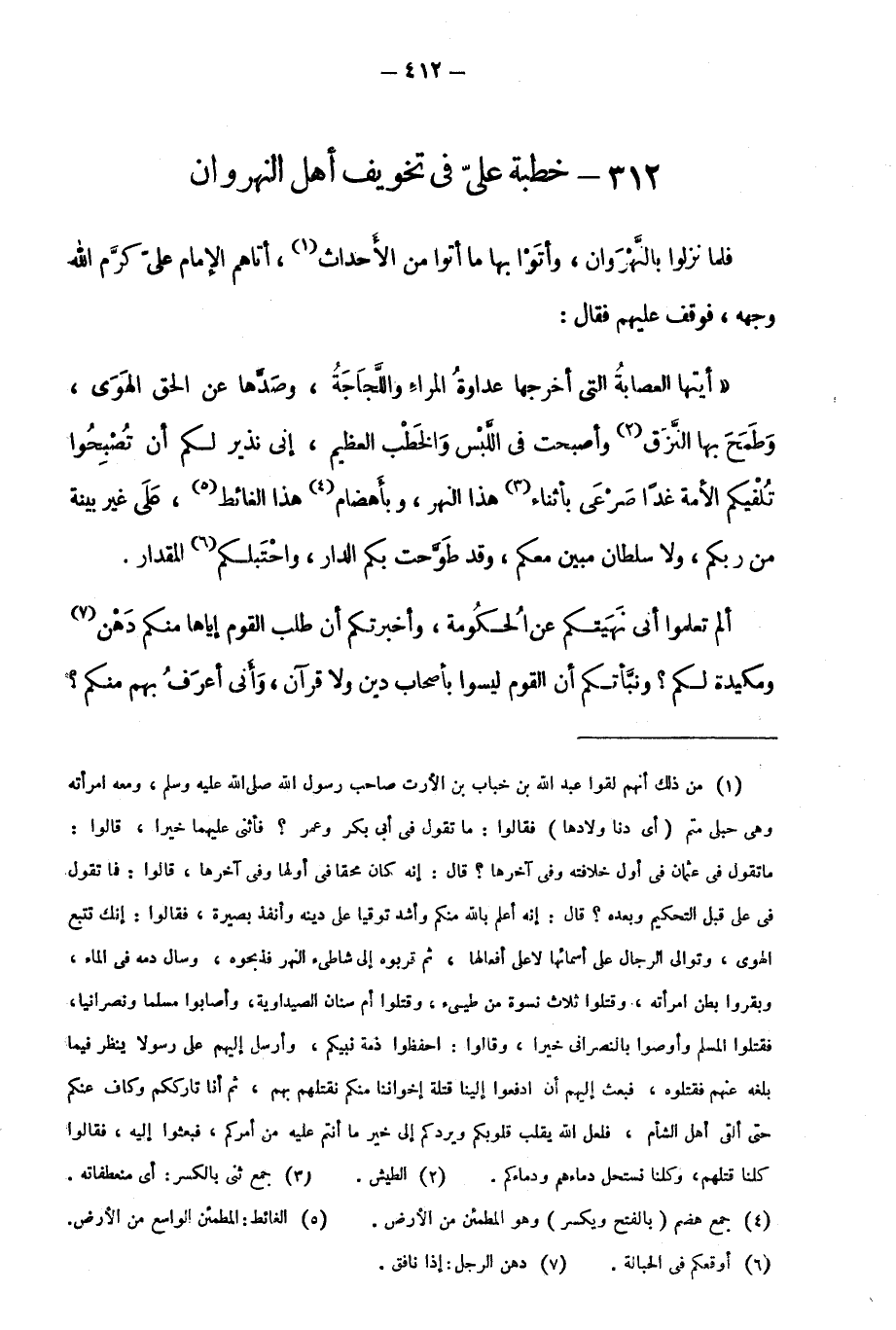 "أيها العصابة التي أخرجها عداوة المراء واللجاجة، وصدها عن الحق الهوى، وطمح بها النزق2 وأصبحت في اللبس والخطب العظيم، إني نذير لكم أن تصبحوا تلفيكم الأمة غدًا صرعى بأثناء3 هذا النهر، وبأهضام4 هذا الغائط5، على غير بينة من ربكم، ولا سلطان مبين معكم، وقد طوحت بكم الدار، واحتبلكم6 المقدار.