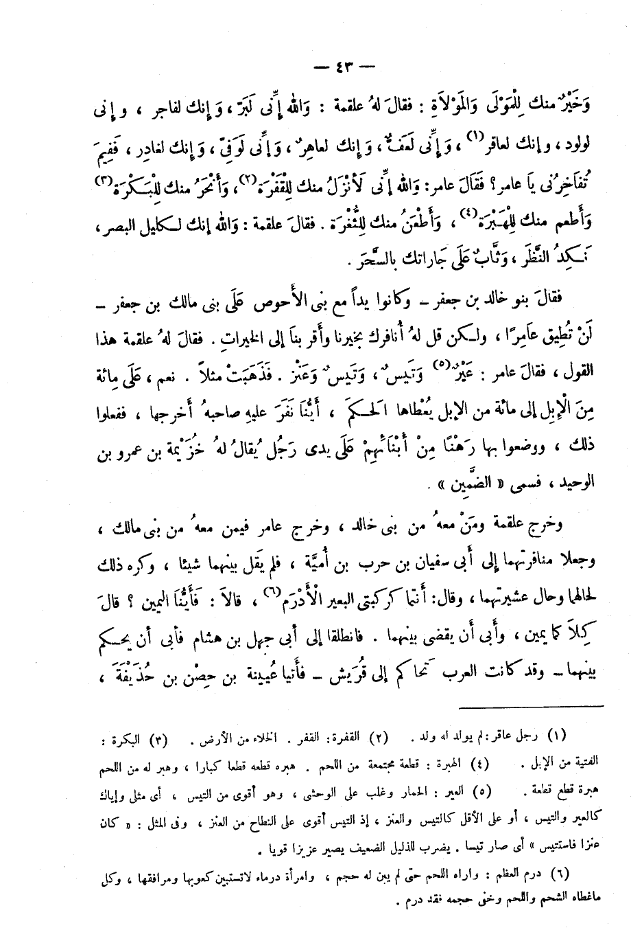 فقال بنو خالد بن جعفر -وكانوا يدًا مع بني الأحوص على بني مالك بن جعفر- لن تطيق عامرًا؛ ولكن قل له أنافرك وأقر بنا إلى الخيرات؛ فقال له علقمة هذا القول، فقال عامر: عير5 وتيس، وتيس وعنز. فذهبت مثلًا. نعم، على مائة من الإبل إلى مائة من الإبل يعطاها الحكم، أينا نفر عليه صاحبه أخرجها؛ ففعلوا ذلك، ووضعوا بها رهنًا من أبنائهم على يدي رجل يقال له خزيمة بن عمرو بن الوحيد؛ فسمي "الضمين".