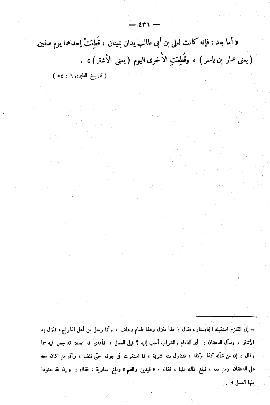 "أما بعد: فإنه كانت لعلي بن أبي طالب يدان يمينان، وقطعت إحدهما يوم صفين "يعني عمار بن ياسر"، وقطعت الأخرى اليوم "يعني الأشتر" ".