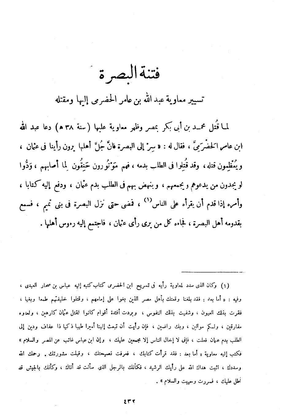 لما قتل محمد بن أبي بكر بمصر وظهر معاوية عليها "سنة 38هـ" دعا عبد الله بن عامر الحضرمي، فقال له: "سر إلى البصرة فإن جل أهلها يرون رأينا في عثمان، ويعظمون قتله، وقد قتلوا في الطلب بدمه، فهم موتورون حنقون لما أصابهم، ودوا لو يجدون من يدعوهم ويجمعهم، وينهض بهم في الطلب بدم عثمان، ودفع إليه كتابًا، وأمره إذا قدم أن يقرأه على الناس1، فمضى حتى نزل البصرة في بني تميم، فسمع بقدومه أهل البصرة، فجاءه كل من يرى عثمان، فاجتمع إليه رءوس أهلها.