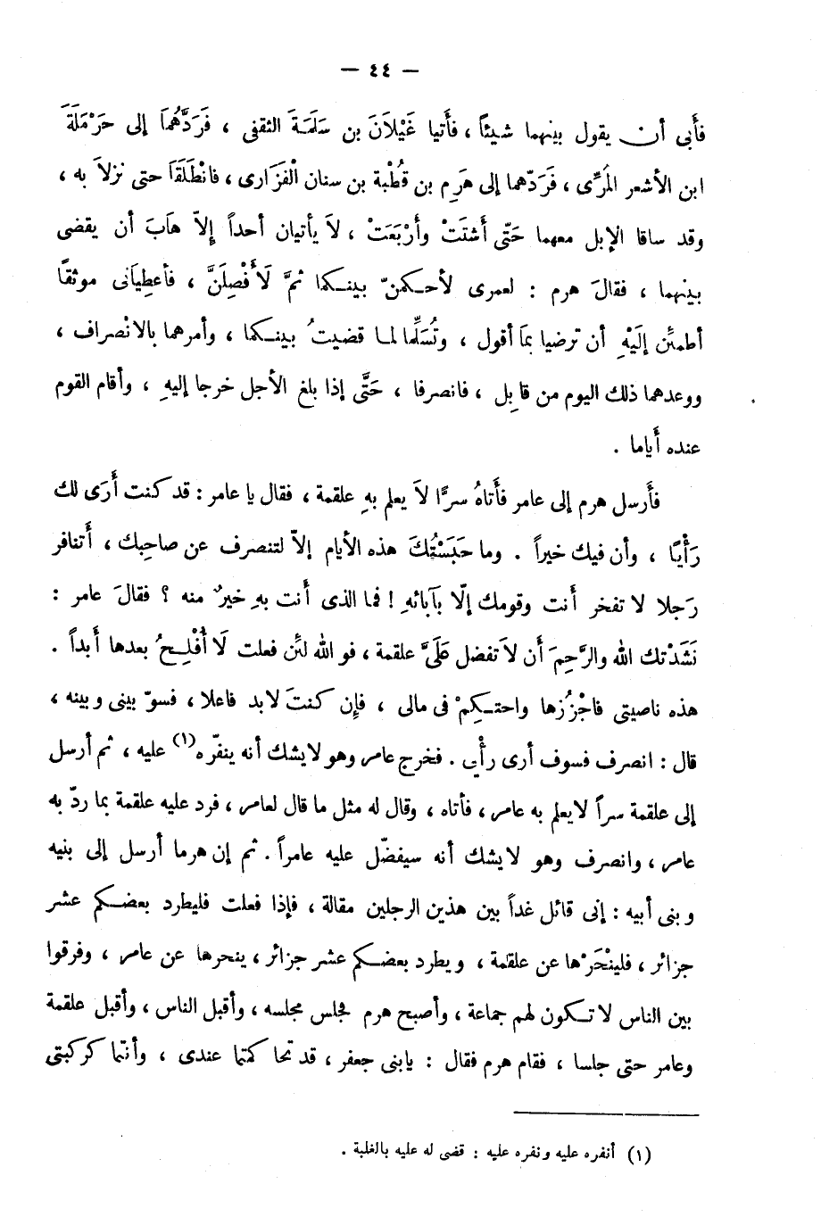 فأرسل هرم إلى عامر فأتاه سرًا لا يعلم به علقمة؛ فقال يا عامر: قد كنت أرى لك رأيًا، وأن فيك خيرًا. وما حبستك هذه الأيام إلا لتنصرف عن صاحبك، أتنافر رجلًا لا تفخر أنت وقومك إلا بآبائه! فما الذي أنت به خير منه؟ فقال عامر: نشدتك الله والرحم أن لا تفضل علي علقمة، فوالله لئن فعلت لا أفلح بعدها أبدًا. هذه ناصيتي فاجزرها واحتكم في مالي؛ فإن كنت لابد فاعلًا، فسو بيني وبينه، قال: انصرف فسوف أرى رأيي. فخرج عامر وهو لا يشك أنه ينفره1 عليه، ثم أرسل إلى علقمة سرًا لا يعلم به عامر، فأتاه، وقال له مثل ما قال لعامر، فرد عليه علقمة بما رد به عامر، وانصرف وهو لايشك أنه سيفضل عليه عامرًا. ثم إن هرمًا أرسل إلى بنيه وبني أبيه: إني قائل غدًا بين هذين الرجلين مقالة؛ فإذا فعلت فليطرد بعضكم عشر جزائر، فينحرها عن علقمة، ويطرد بعضكم عشر جزائر، ينحرها عن عامر، وفرقوا بين الناس لا تكون لهم جماعة، وأصبح هرم فجلس مجلسه، وأقبل الناس، وأقبل علقمة وعامر حتى جلسا، فقام هرم فقال: يا بني جعفر، قد تحاكمتما عندي، وأنتما كركبتي