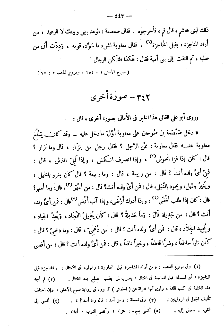 "دخل صعصعة بن صوحان على معاوية أول ما دخل عليه –وقد كان يبلغ معاوية عنه فقال معاوية: ممن الرجل؟ فقال رجل من نزار، قال وما نزار؟ قال: كان إذا غزا انحوش1، وإذا انصرف انكمش، وإذا لقي افترش، قال: فمن أي ولده أنت؟ قال: من ربيعة، قال: وما ربيعة؟ قال كان يغزو بالخيل، ويغير بالليل، ويجود بالنيل، قال: فمن أي ولده أنت؟ قال: من أمهر2، قال: وما أمهر؟ قال: كان إذا طلب أفضى3، وإذا أدرك أرضى، وإذا آب أنضى4 قال: فمن أي ولده أنت؟ قال: من جديلة قال: وما جديلة؟ قال: كان يطيل النجاد، ويعد الجياد، ويجيد الجلاد، قال: فمن أي ولده أنت؟ قال: من دعمي، قال: وما دعمي؟ قال: كان نارًا ساطعًا، وشرًّا قاطعًا، وخيرًا نافعًا، قال: فمن أي ولده أنت؟ قال: من أفصى