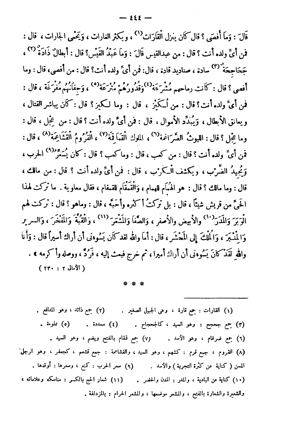 قال: وما أفصى؟ قال كان ينزل القارات1، ويكثر الغارات، ويحمي الجارات، قال: فمن أي ولده أنت؟ قال: من عبد القيس قال: وما عبد القيس؟ قال: أبطال ذادة2، جحاجحة3 سادة، صناديد قادة، قال: فمن أي ولده أنت؟ قال: من أفصى، قال: وما أفصى؟ قال: كانت رماحهم مشرعة4 وقدورهم مترعة5، وجفانهم مفرغة، قال: فمن أي ولده أنت؟ قال: من لكيز، قال: وما لكيز؟ قال: كان يباشر القتال، ويعانق الأبطال، ويبدد الأموال، قال: فمن أي ولده أنت:؟ قال: من عجل، قال: وما عجل؟ قال: الليوث الضراغمة6، الملوك القماقمة7، القروم القشاعمة8، قال: فمن أي ولده أنت؟ قال: من كعب، قال: وما كعب؟ قال: كان يسعر9 الحرب، ويجيد الضرب، ويكشف الكرب، قال: فمن أي ولده أنت؟ قال: من مالك، قال: وما مالك؟ قال: هو الهمام للهمام، والقمقام للقمقام، فقال معاوية: ما تركت لهذا الحي من قريش شيئًا، قال: بل تركت أكثره وأحبه، قال: وما هو؟ قال: تركت لهم الوبر والمدر10 والأبيض والأصفر، والصفا والمشعر11، والقبة والمفخر، والسرير والمنبر، والملك إلى المحشر، قال: أما والله لقد كان يسوءني أن أراك أسيرًا قال: وأنا والله لقد كان يسوءني أن أراك أميرًا، ثم خرج فبعث إليه، فرد، ووصله وأكرمه".