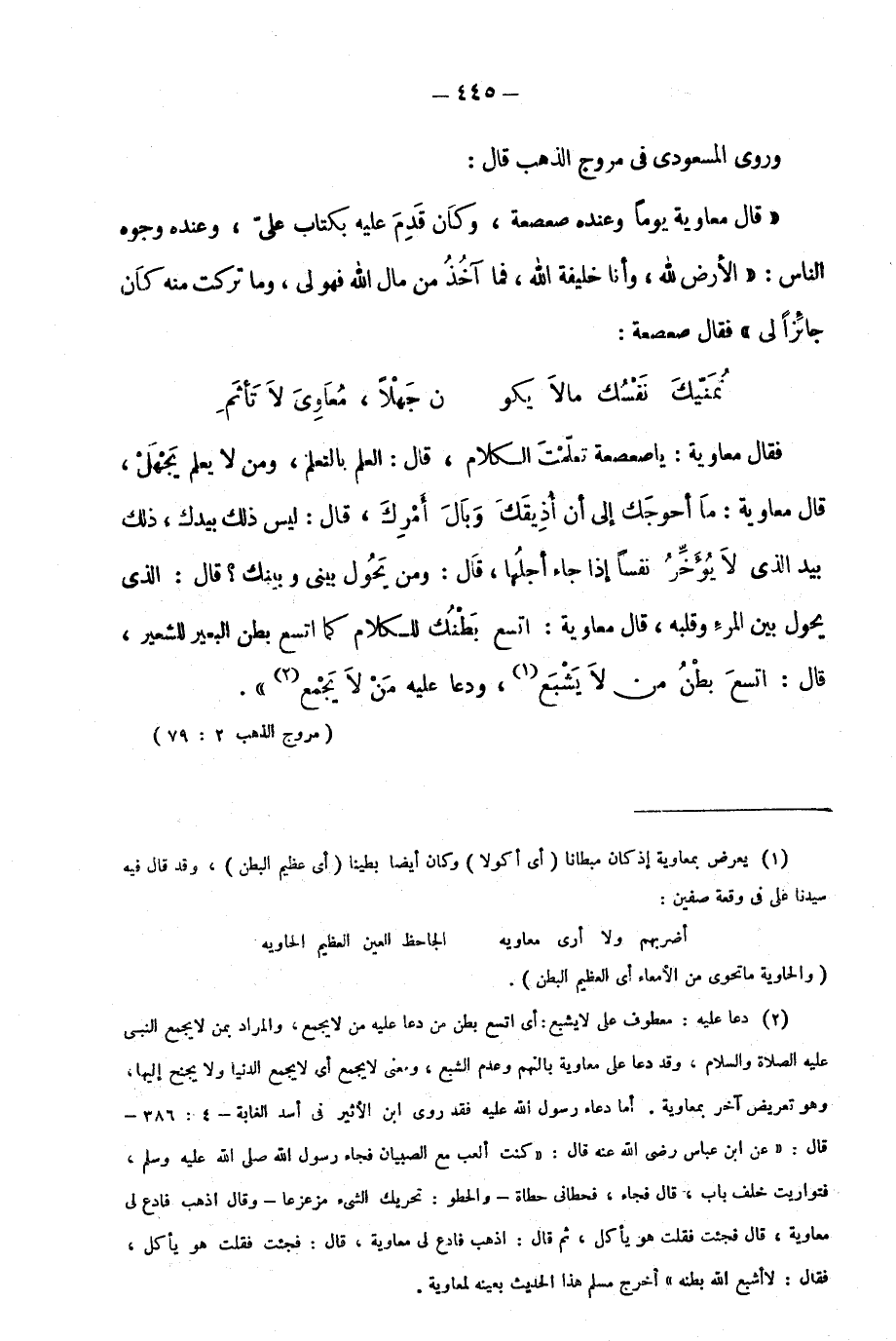 2 دعا عليه: معطوف على لا يشبع: أي اتسع بطن من دعا إليه من لا يجمع، والمراد بمن لا يجمع النبي عليه الصلاة والسلام، وقد دعا على معاوية بالنهم وعدم الشبع، ومعنى لا يجمع أي لا يجمع الدنيا ولا يجنح إليها، وهو تعريض آخر بمعاوية. أما دعاء رسول الله صلى الله عليه فقد روى ابن الاثير في أسد الغابة -4: 386- قال: "عن ابن عباس رضي الله عنه قال: "كنت ألعب مع الصبيان فجاء رسول الله صلى الله عليه وسلم، فتواريت خلف باب، قال فجاء، فحطاني حطاة –والحطو: تحريك الشيء مزعزعًا- وقال اذهب فادع لي معاوية، قال فجئت فقلت هو يأكل، ثم قال: اذهب فادع لي معاوية، قال: فجئت فقلت هو يأكل، فقال: لا أشبع الله بطنه" أخرج مسلم هذا الحديث بعينه لمعاوية.