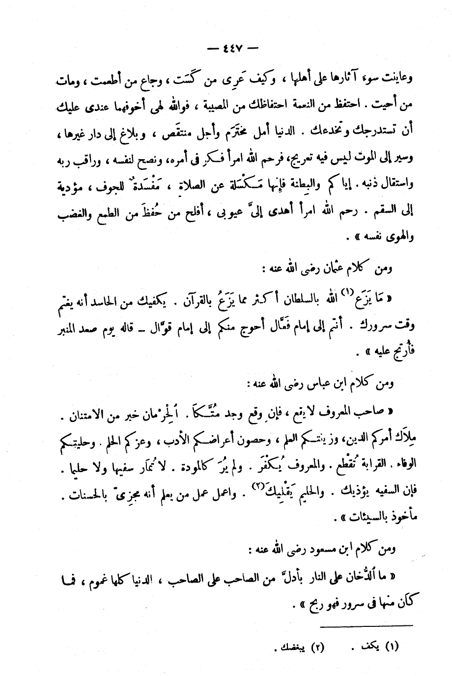 وعاينت سوء آثارها على أهلها، وكيف عري من كست، وجاع من أطعمت، ومات من أحيت. احتفظ من النعمة احتفاظك من المصيبة، فوالله لهي أخوفهما عندي عليك أن تستدرجك وتخدعك. الدنيا أمل مخترم وأجل منتقص، وبلاغ إلى دار غيرها، وسير إلى الموت ليس فيه تعريج، فرحم الله امرأ فكر في أمره، ونصح لنفسه، وراقب ربه واستقال ذنبه. إياكم والبطنة فإنها مكسلة عن الصلاة، مفسدة للجوف، مؤدية إلى السقم. رحم الله امرأ أهدى إلي عيوبي، أفلح من حفظ من الطمع والغضب والهوى نفسه".