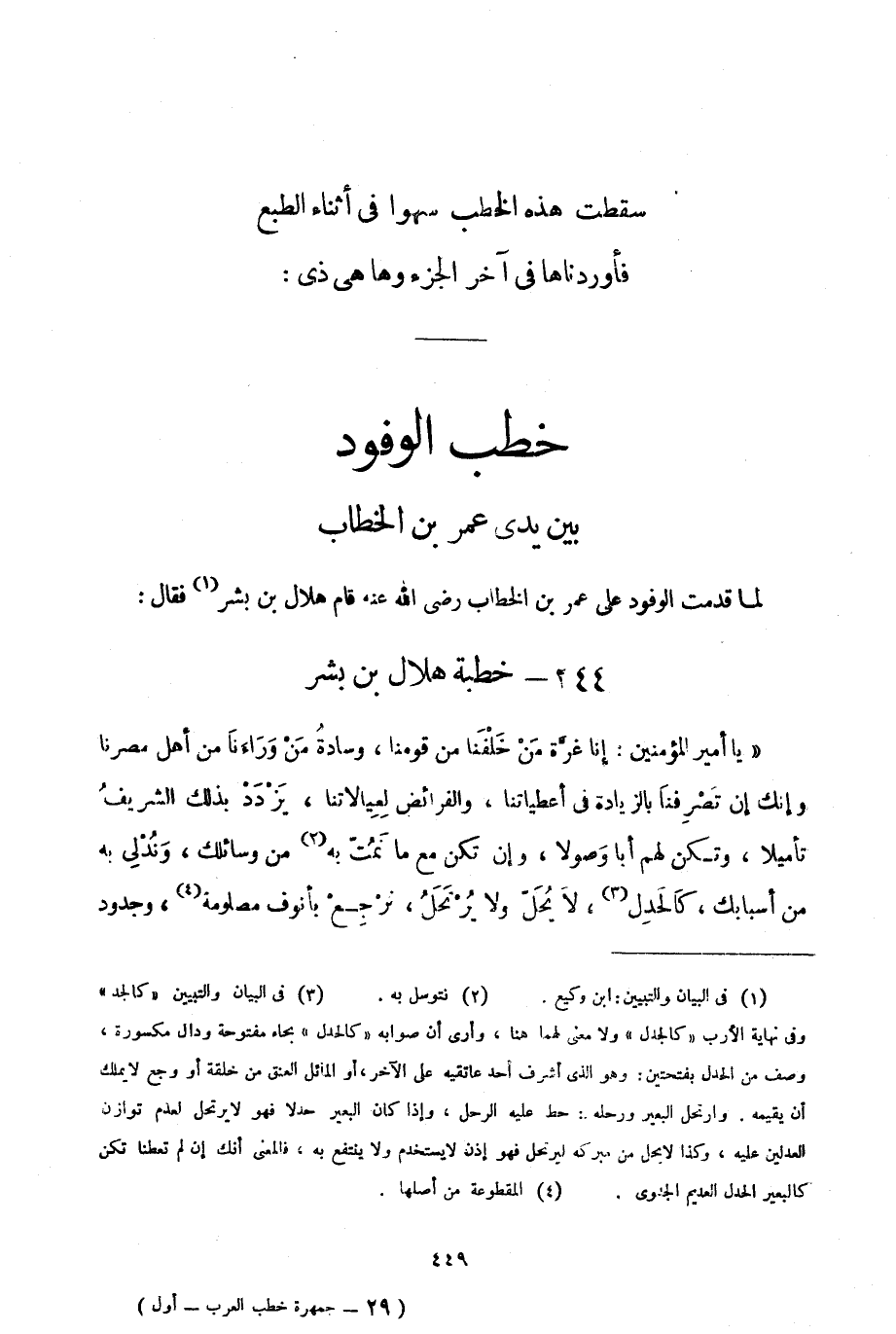 لما قدمت الوفود على عمر بن الخطاب رضي الله عنه قام هلال بن بشر1 فقال: