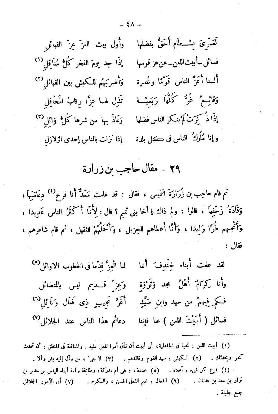 ثم قام حاجب بن زرارة التميمي؛ فقال: قد علمت معد أنا فرع1 دعامتها، وقادة زحفها، قالوا: ولم ذاك يا أخا بني تميم؟ قال: لأنا أكثر الناس عديدًا، وأنجهم طرًا وليدًا، وأنا أعطاهم للجزيل، وأحملهم للثقيل، ثم قام شاعرهم، فقال: