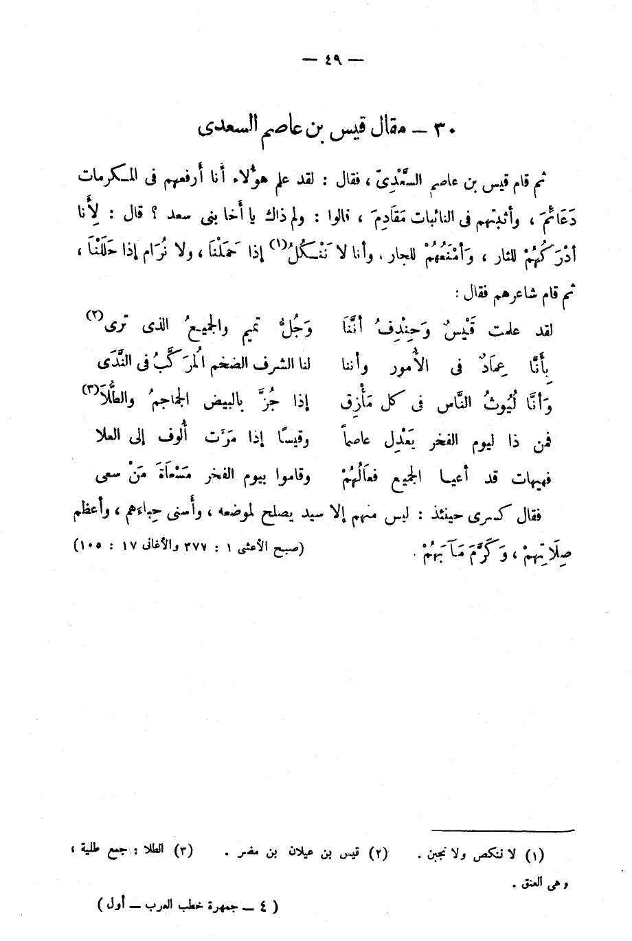 ثم قام قيس بن عاصم السعدي؛ فقال: لقد علم هؤلاء أنا أرفعهم في المكرمات دعائم، وأثبتهم في النائبات مقادم، قالوا: ولم ذاك يا أخا بني سعد؟ قال: لأنا أدركهم للنار، وأمنعهم للجار. وأنا لا ننكل1 إذا حملنا، ولا نرام إذا حللنا، ثم قام شاعرهم فقال: