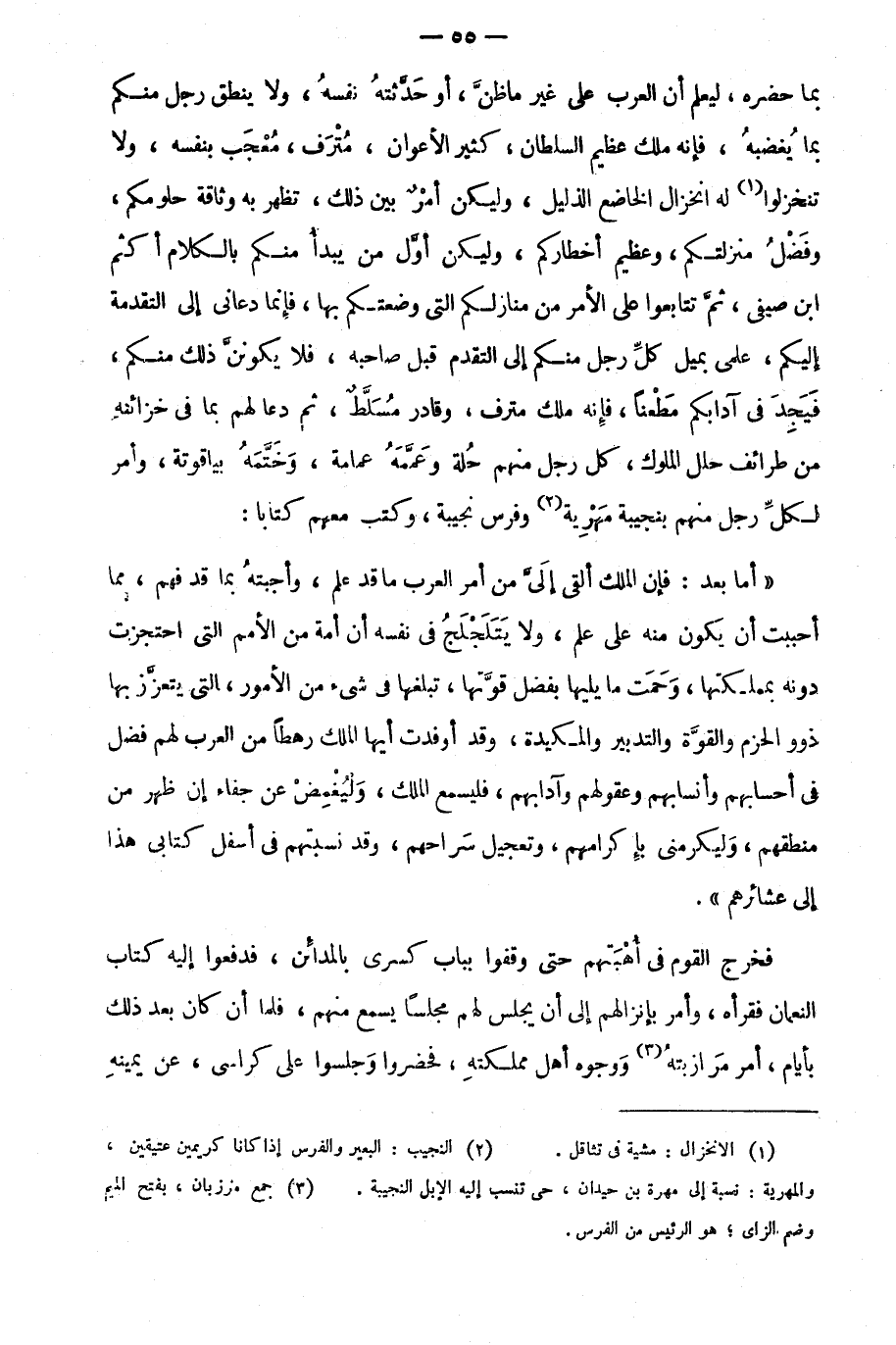 "أما بعد: فإن الملك ألقى إلي أمر العرب ما قد علم، وأجبته بما قد فهم، مما أحببت أن يكون منه على علم، ولا يتلجلج في نفسه أن أمة من الأمم التي احتجزت دونه بمملكتها، وحمت ما يليها بفضل قوتها، تبلغها وشيء من الأمور، التي تعزز بها ذوو الحزم والقوة والتدبير والمكيدة، وقد أوفدت إليها الملك رهطًا من العرب لهم فضل في أحسابهم وأنسابهم وعقولهم وآدابهم؛ فليسمع الملك، وليغمض عن جفاء إن ظهر من منطقهم، وليكرمني بإكرامهم، وتعجيل سراحهم، وقد نسبتهم في أسفل كتابي هذا إلى عشائرهم".