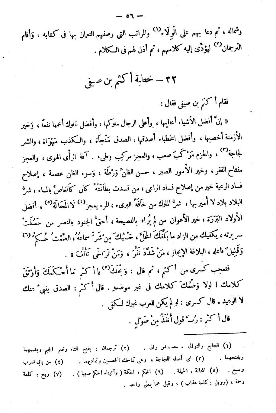 فتعجب كسرى من أكثم، ثم قال: ويحك5 يا أكثم ما أحكمك وأوثق كلامك! لولا وضعك كلامك في غير موضعه. قال أكثم: الصدق ينبئ عنك لا الوعيد. قال كسرى: لو لم يكن للعرب غيرك لكفى.