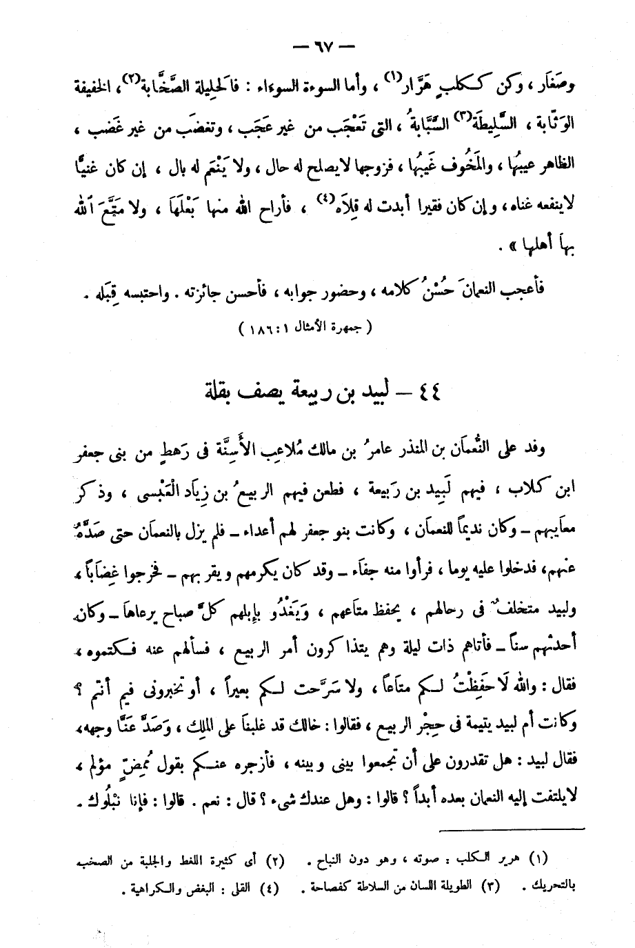 وفد على النعمان بن المنذر عامر بن مالك مُلَاعب الأسِنّة في رهط من بني جعفر بن كلاب، فيهم لبيد بن ربيعة، فطعن فيهم الربيع بن زياد العبسي، وذكر معايبهم -وكان نديمًا للنعمان، وكانت بنو جعفر لهم أعداء- فلم يزل بالنعمان حتى صده عنهم؛ فدخلوا عليه يومًا، فرأوا منه جفاء -وقد كان يكرمهم ويقربهم- فخرجوا غضابًا، ولبيد متخلف في رحالهم، يحفظ متاعهم، ويغدو بإبلهم كل صباح يرعاها -وكان أحدثهم سنًّا- فأتاهم ذات ليلة وهم يتذاكرون أمر الربيع؛ فسألهم عنه فكتموه، فقال: والله لا حفظت لكم متاعًا، ولا سرحت لكم بعيرًا، أو تخبروني فيم أنتم؟ وكانت أم لبيد يتيمة في حجر الربيع، فقالوا: خالك قد غلبنا على الملك، وصد عنا وجهه، فقال لبيد: هل تقدرون على أن تجمعوا بيني وبينه، فأزجره عنكم بقول ممض مؤلم، لا يلتفت إليه النعمان بعده أبدًا؟ قالوا: وهل عندك شيء؟ قال: نعم. قالوا: فإنا نبلوك.