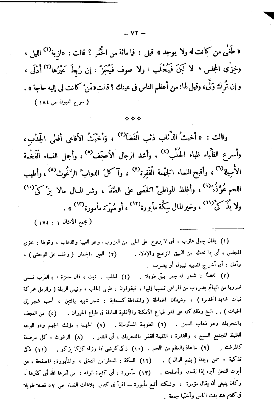 وقالت: "أخبث الذئاب ذئب الغضا3، وأخبث الأفاعي أفعى الجدب، وأسرع ظباء الحلب4، وأشد الرجال الأعجف5، وأجمل النساء الفخمة الأسيلة6، وأقبح النساء الجهمة القفرة7، وآكل الدواب الرغوث8، وأطيب اللحم عوذه9، وأغلظ المواطئ الحصى على الصفا، وشر المال مالًا يزكى10 ولا يذكي11، وخير المال سكة مأبورة12، أو مهرة مأمورة13".