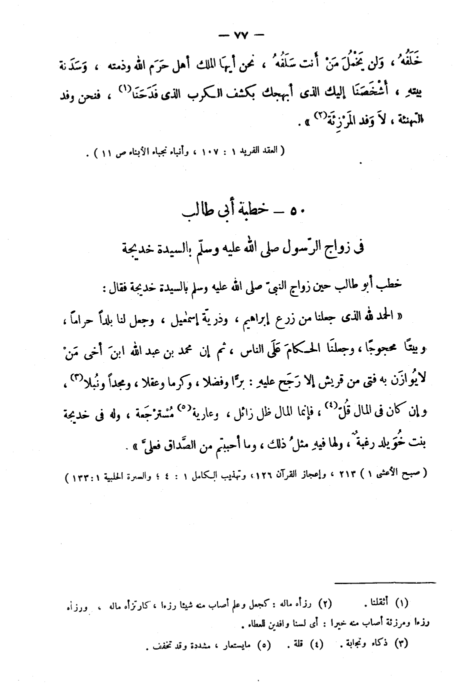 خطب أبو طالب حين زواج النبي صلى الله عليه وسلم بالسيدة خديجة فقال: