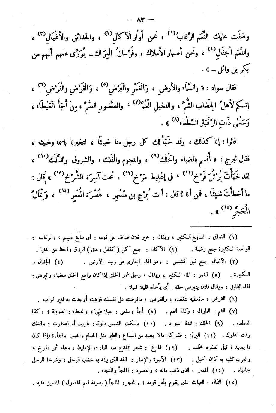 وضفت عليك النعم الرغاب1، نحن أولو الآكال2، والحدائق والأغيال3، والنعم الجفال4، ونحن أسهار الأملاك، وفرسان العراك -يوري عنهم أنهم من بكر بن وائل-".