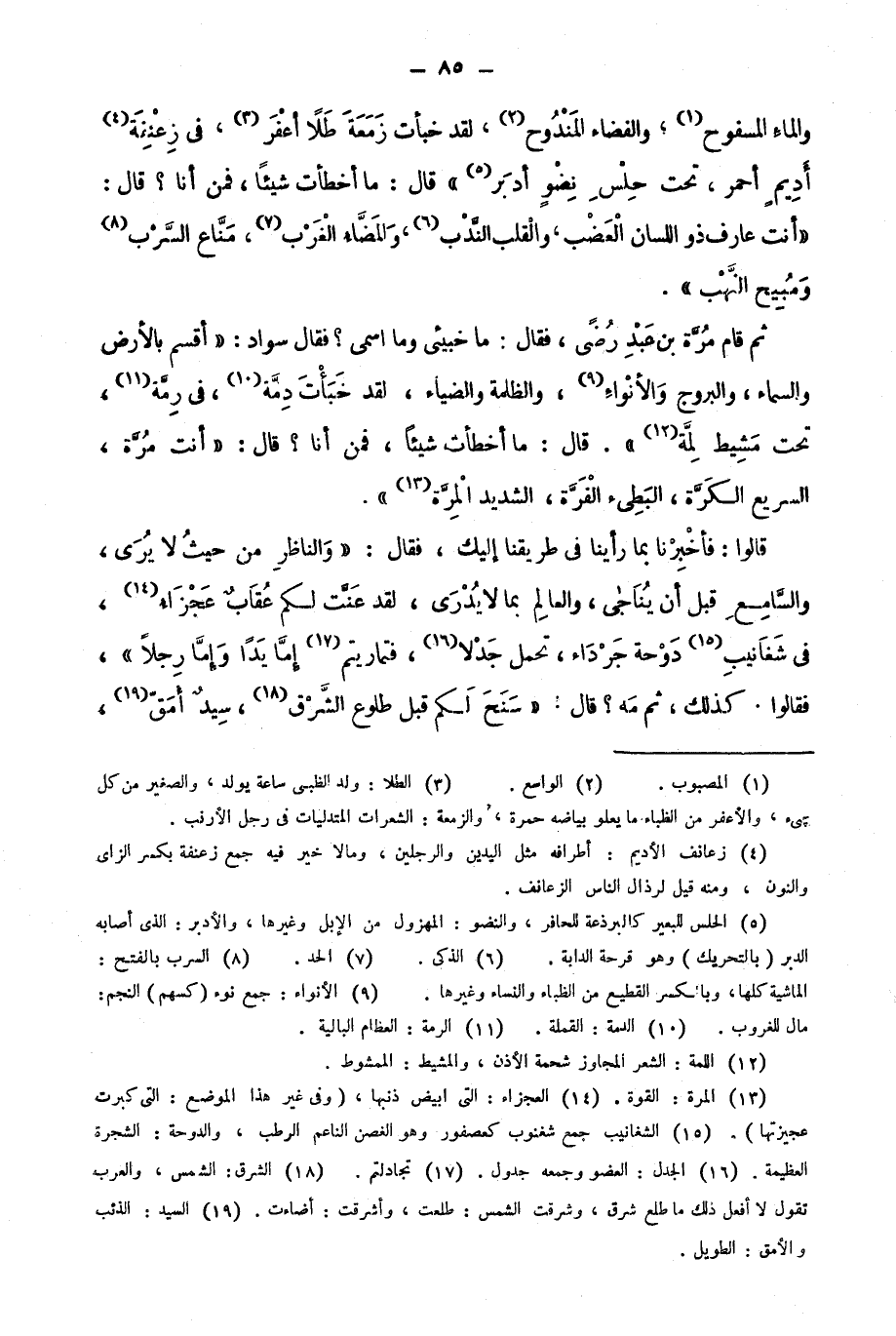 قالوا: فأخبرنا بما رأينا في طريقنا إليك؛ فقال: "والناظر من حيث لا يرى والسامع قبل أن يناجى، والعالم بما لا يدري، لقد عنت لكم عقاب عجزاء14، في شغانيب15 دوحة جرداء، تحمل جدلًا16، فتماريتم17 إما يدًا وإما رجلًا"؛ فقالوا. كذلك، ثم مه؟ قال: "سنح لكم قبل طلوع الشرق 18، سيد أمق19،