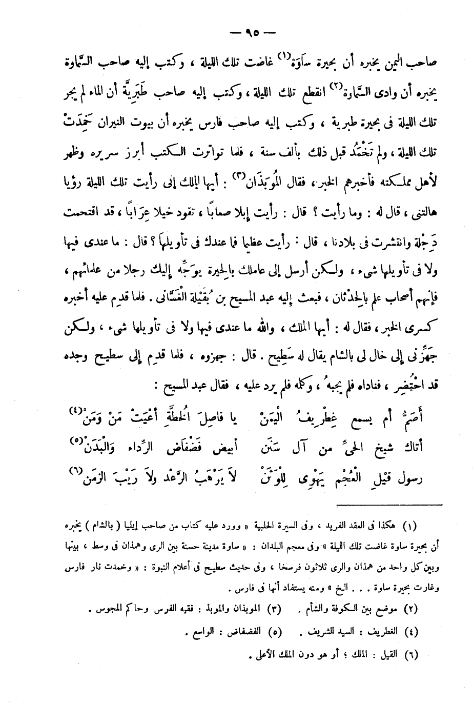 1 هكذا في العقد الفريد، وفي السيرة الحلبية "وورد عليه كتاب من صاحب إيليا "بالشام" يخبره أن بحيرة ساوة غاضت تلك الليلة" وفي معجم البلدان: "ساوة مدينة حسنة بين الري وهمذان في وسط، بينها وبين كل واحد من همذان والري ثلاثون فرسخًا، وفي حديث سطيح في أعلام النبوة: "وخمدت نار فارس وغارت بحيرة ساوة ... إلخ" ومنه يستفاد أنها في فارس.
