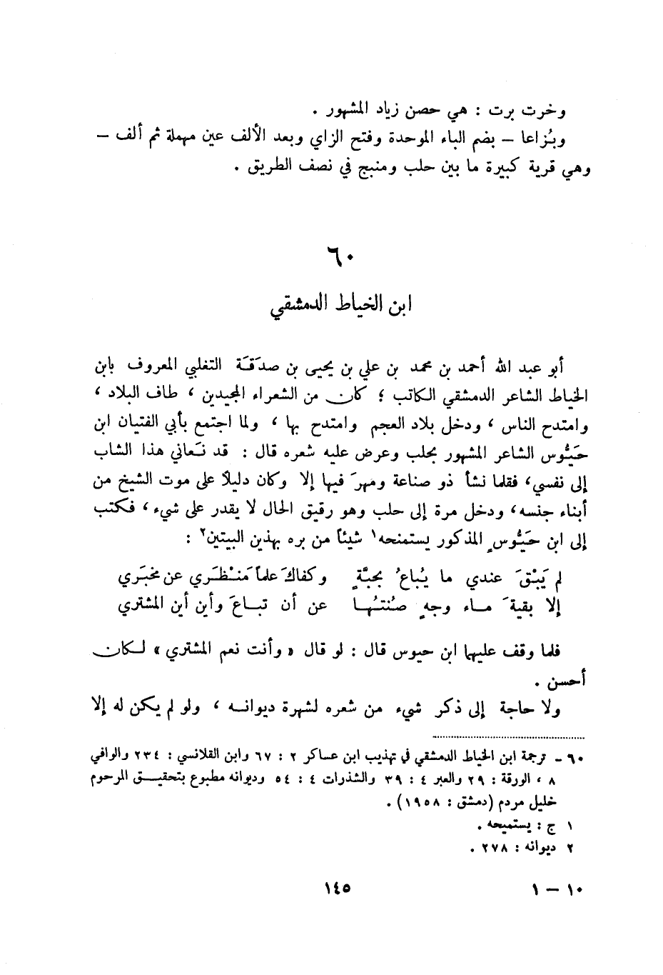 (1) ترجمة ابن الخياط الدمشقي في تهذيب ابن عساكر 2: 67 وابن القلانسي: 234 والوافي 8، الورقة: 29 والعبر 4: 39 والشذرات 4: 54 وديوانه مطبوع بتحقيق المرحوم خليل مردم (دمشق: 1958) .