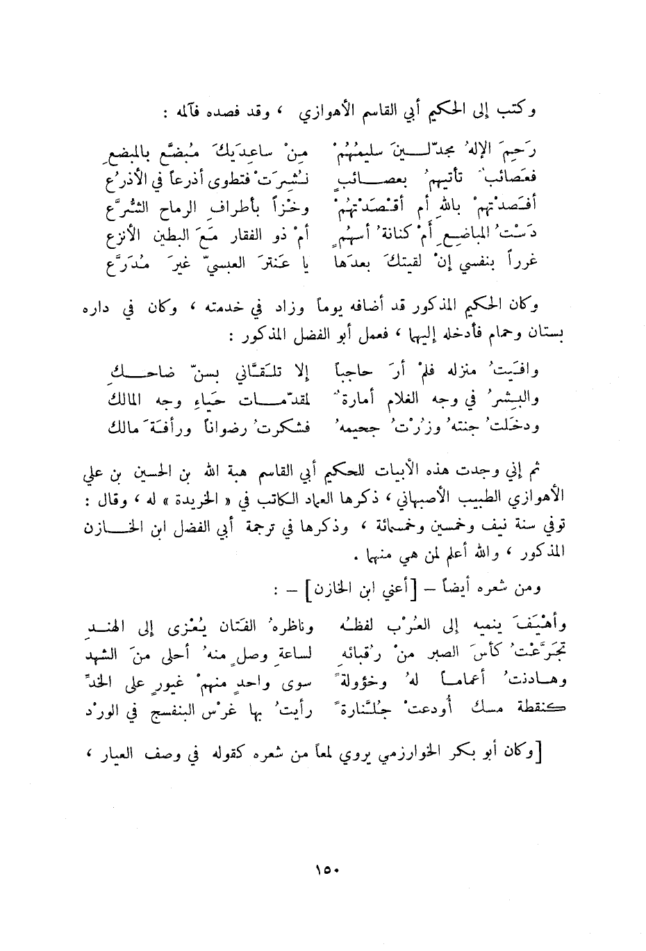 غرراً بنفسي إن لقيتك بعدها ... يا عنتر العبسي غير مدرع وكان الحكيم المذكور قد أضافه يوماً وزاد في خدمته، وكان في داره بستان وحمام فأدخله إليهما، فعمل أبو الفضل المذكور: