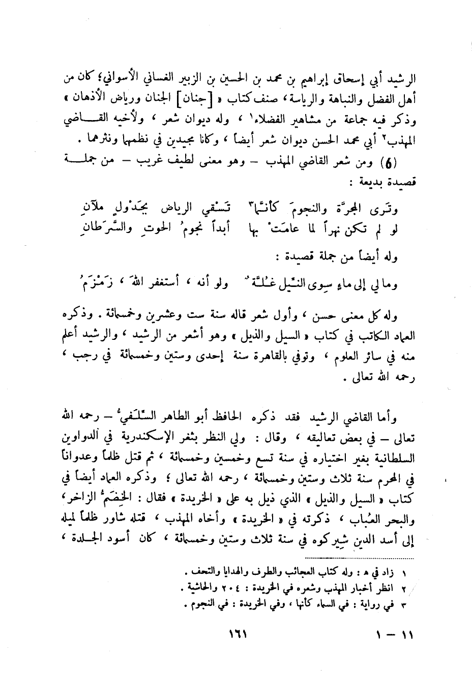 وما لي إلى ماءٍ سوى النيل غلة ... ولو أنه، أستغفر الله، زمزم وله كل معنى حسن، وأول شعر قاله سنة ست وعشرين وخمسمائة. وذكره العماد الكاتب في كتاب السيل والذيل وهو أشعر من الرشيد، والرشيد أعلم منه في سائر العلوم، وتوفي بالقاهرة سنة إحدى وستين وخمسمائة في رجب، حمه الله تعالى.