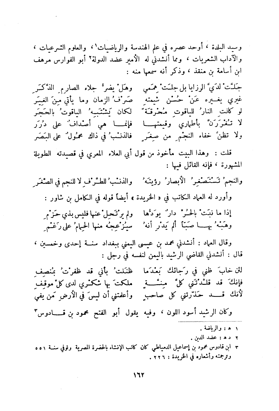 وسيد البلدة، أوحد عصره في علم الهندسة والرياضات (1) ، والعلوم الشرعيات، والآداب الشعريات، ومما أنشدني له الأمير عضد الدولة (2) أبو الفوارس مرهف بن أسامة بن منقذ، وذكر أنه سمعها منه: