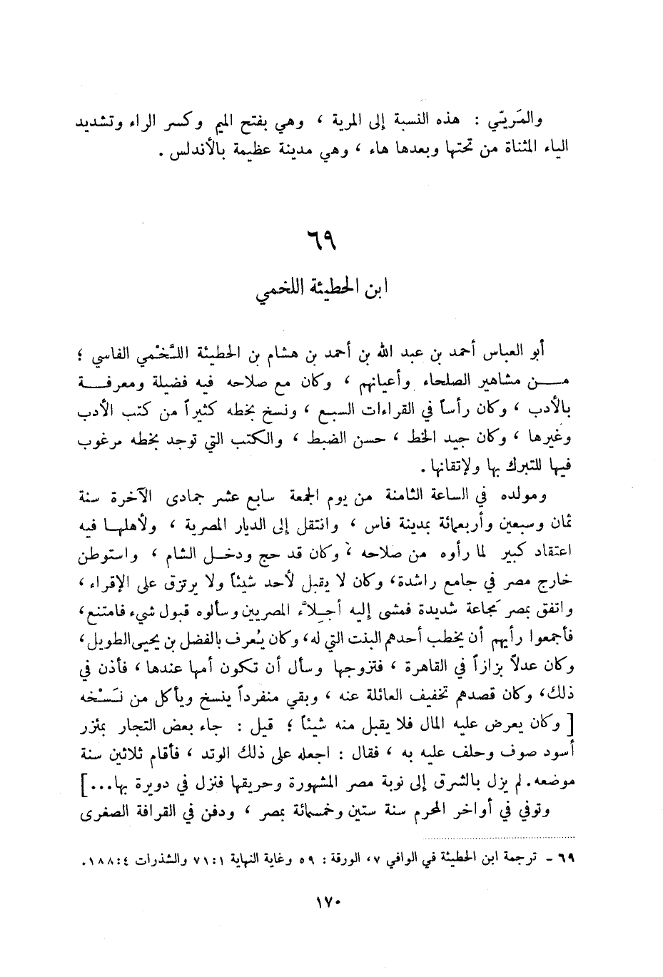 (1) ترجمة ابن الحطيئة في الوافي 7، الورقة: 59 وغاية النهاية 1: 71 والشذرات 4: 188.