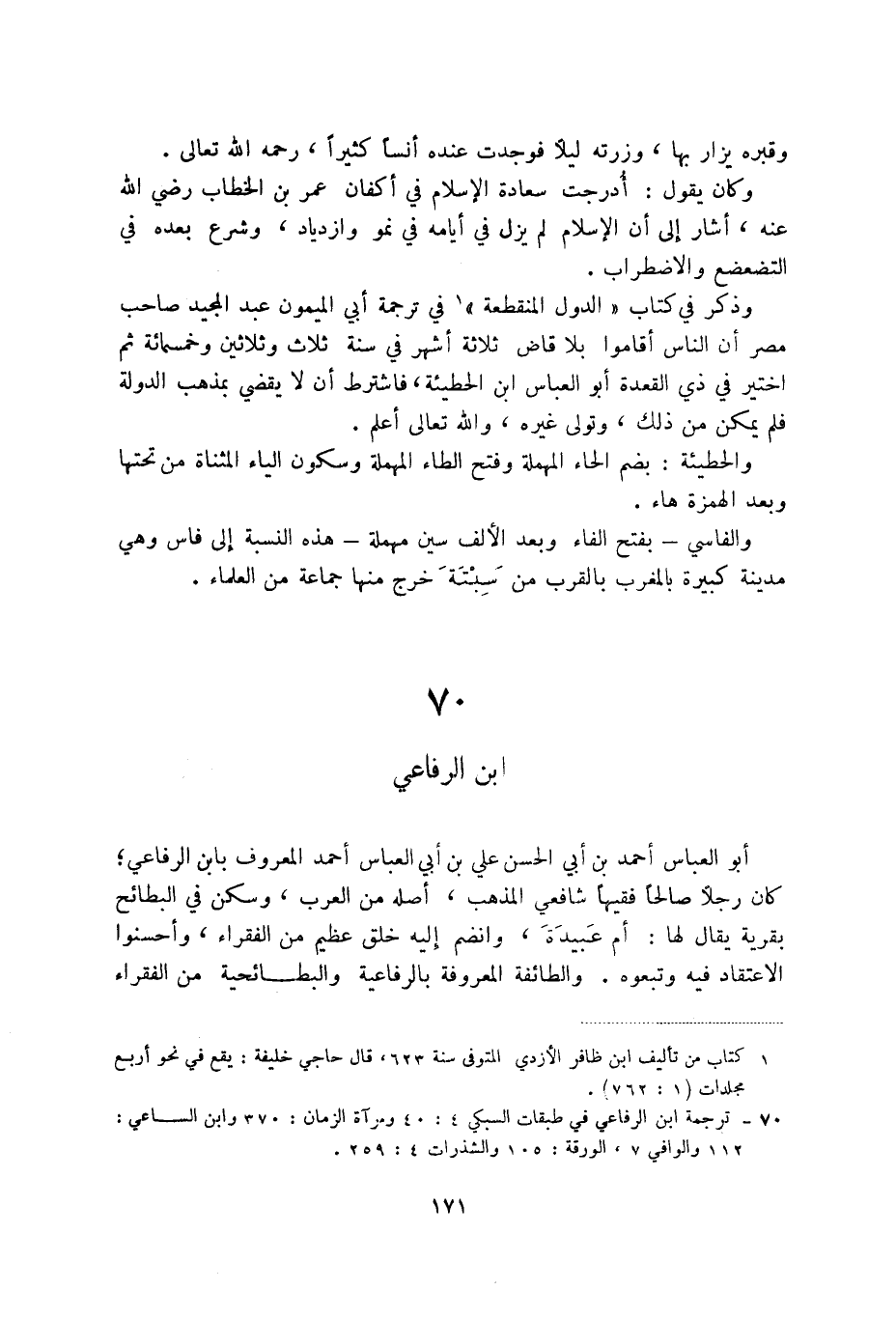 (2) ترجمة ابن الرفاعي في طبقات السبكي 4: 40 ومرآة الزمان: 370 وابن الساعي: 112 والوافي 7، الورقة: 105 والشذرات 4: 259.