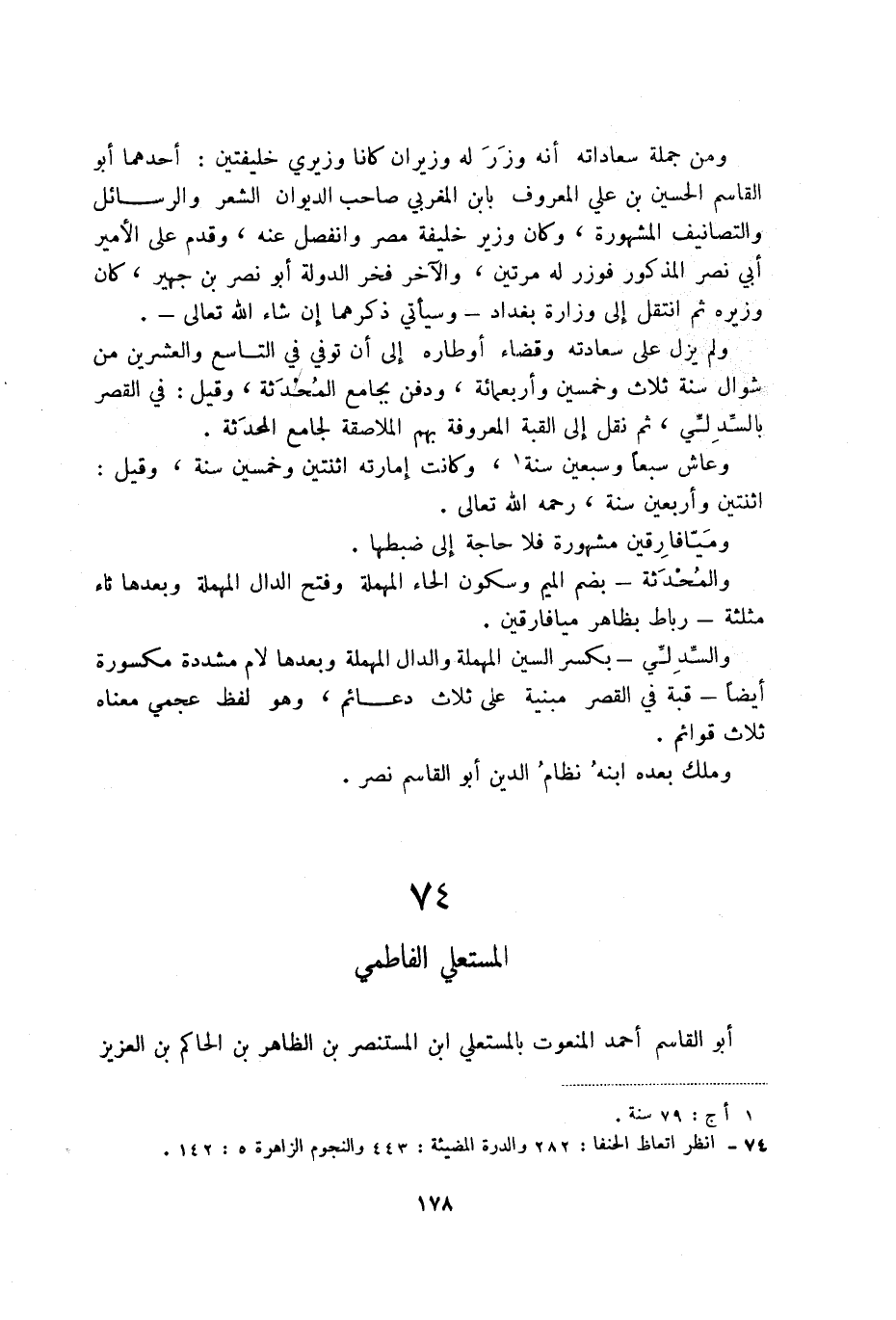 (2) انظر اتعاظ الحنفا: 282 والدرة المضيئة: 443 والنجوم الزاهرة 5: 142.