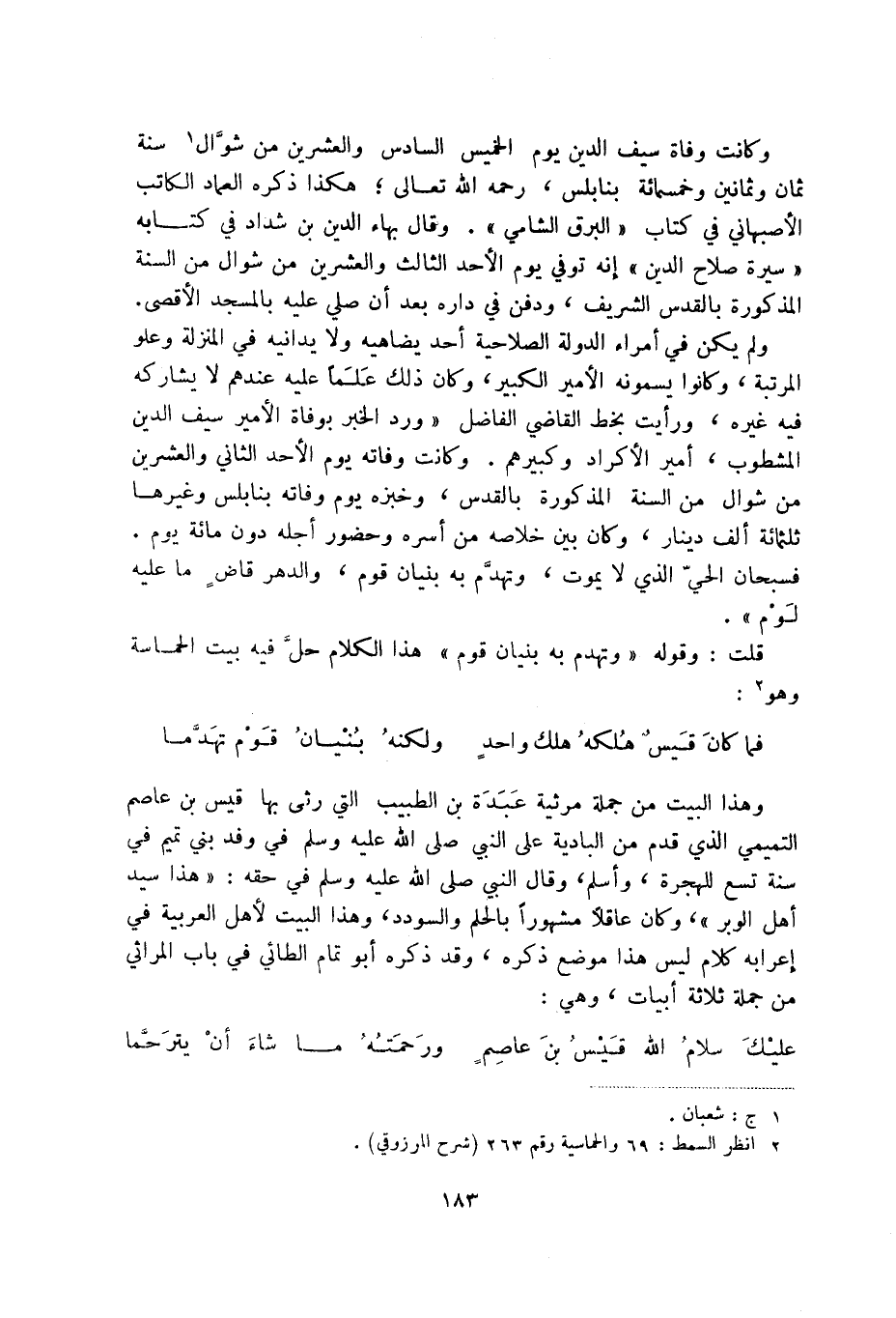 فما كان قيس هلكه هلك واحد ... ولكنه بنيان قوم تهدما وهذا البيت من جملة مرثية عبدة بن الطبيب التي رثى بها قيس بن عاصم التميمي الذي قدم من البادية على النبي صلى الله عليه وسلم في وقد بني تميم في سنة تسع للهجرة، وأسلم، وقال النبي صلى الله عليه وسلم في حقه: هذا سيد أهل الوبر، وكان عاقلاً مشهوراً بالحلم والسودد، وهذا البيت لأهل العربية في إعرابه كلام ليس هذا موضع ذكره، وقد ذكره أبو تمام الطائي في باب المراثي من جملة ثلاثة أبيات، وهي: