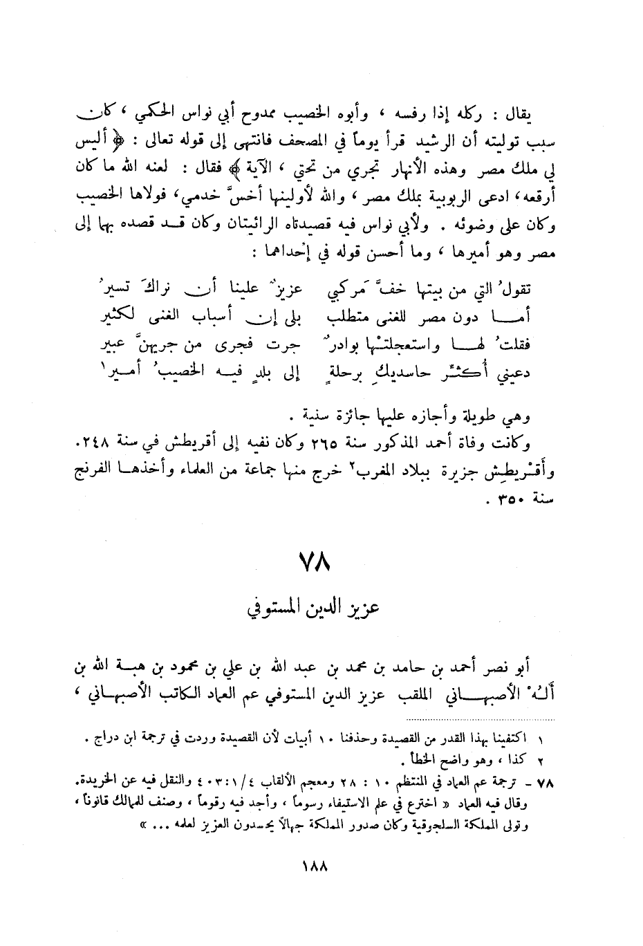 (3) ترجمة عم العماد في المنتظم 10: 28 ومعجم الألقاء 1/4: 403 والنقل فيه عن الخريدة، وقال فيه العماد " اخترع في علم الاسيفاء رسوماً، وأجد فيه رقوماً، وصنف للمالك قانوناً، وتولى المملكة السلجوقية وكان صدور المملكة جهالاً يحسدون العزيز لعلمه ... ".