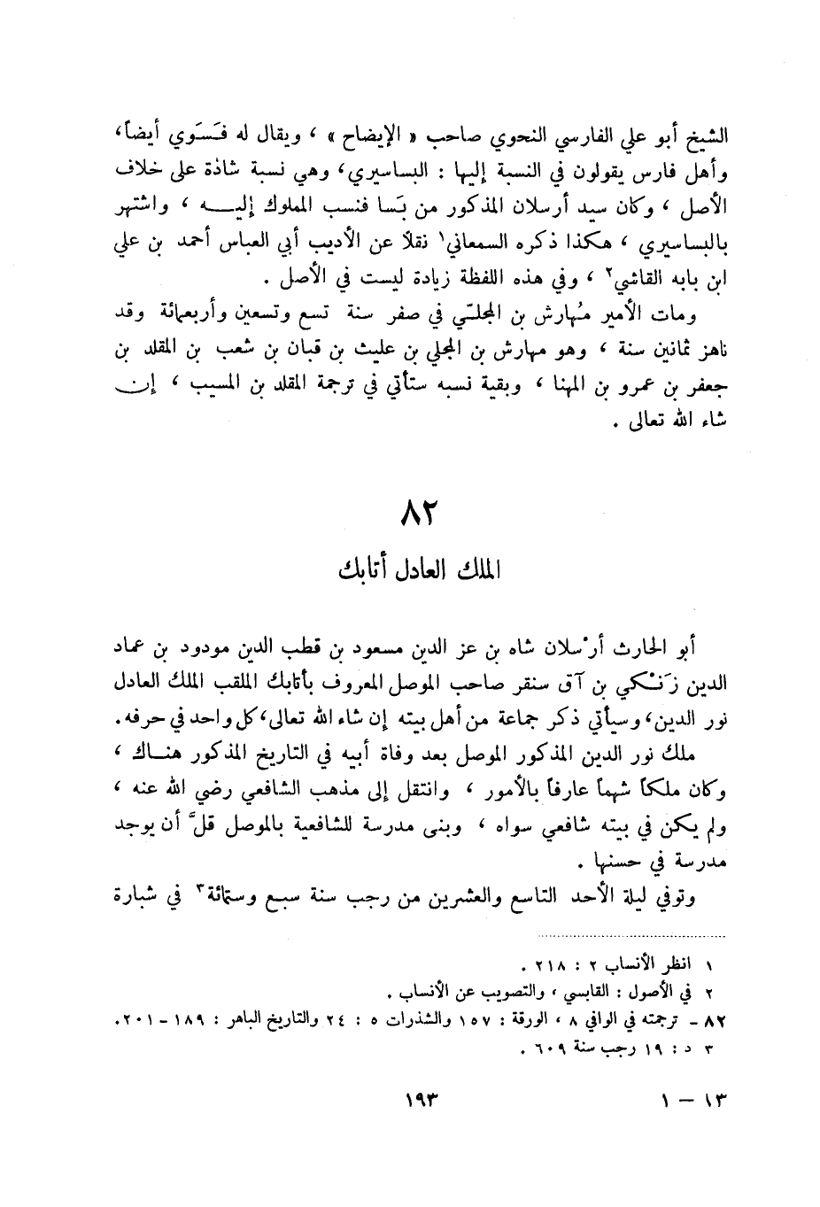 الشيخ أبو علي الفارسي النحوي صاحب الإيضاح، ويقال له فسوي أيضا، وأهل فارس يقولون في النسبة إليها: البساسيري، وهي نسبة شاذة على خلاف الأصل، وكان سيد أرسلان المذكور من بسافنسب المملوك إليه، واشتهر بالبساسيري، هكذا ذكره السمعاني (1) نقلاً عن الديب أبي العباس احمد بن علي ابن بابه القاشي (2) ، وفي هذه اللفظة زيادة ليست في الأصل.