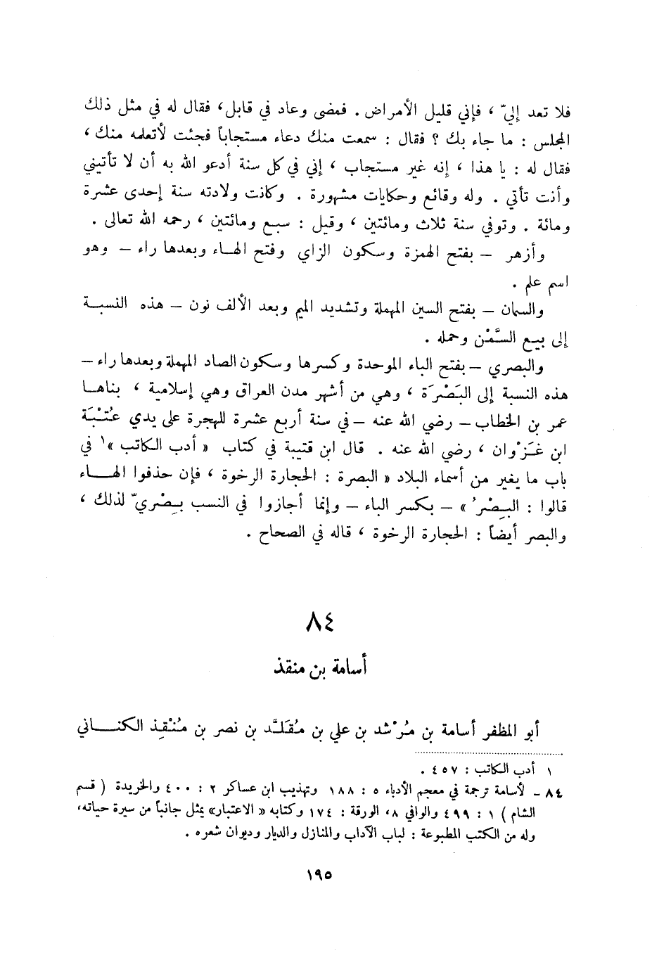 (2) لأسامة ترجمة في معجم الأدباء 5: 188 وتهذيب ابن عساكر 2: 400 والخريدة (قسم الشام) 1: 499 والوافي 8، الورقة: 174 وكتابه " الاعتبار " يمثل جانباً من سيرة حياته، وله من الكتب المطبوعة: لباب الآداب والمنازل والديار وديوان شعره.