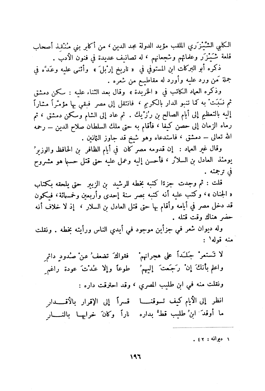 وذكره العماد الكاتب في الخريدة وقال بعد الثناء عليه: سكن دمشق ثم نبت به كما تنبو الدار بالكريم، فانتقل إلى مصر فبقي بها مؤمراً مشاراً إليه بالتعظيم إلى أيام الصالح بن رزيك. ثم عاد إلى الشام وسكن دمشق، ثم رماه الزمان إلى حصن كيفا، فأقام به حتى ملك السلطان صلاح الدين - رحمه الله تعالى - دمشق، فاستدعاه وهو شيخ قد جاوز الثمانين.