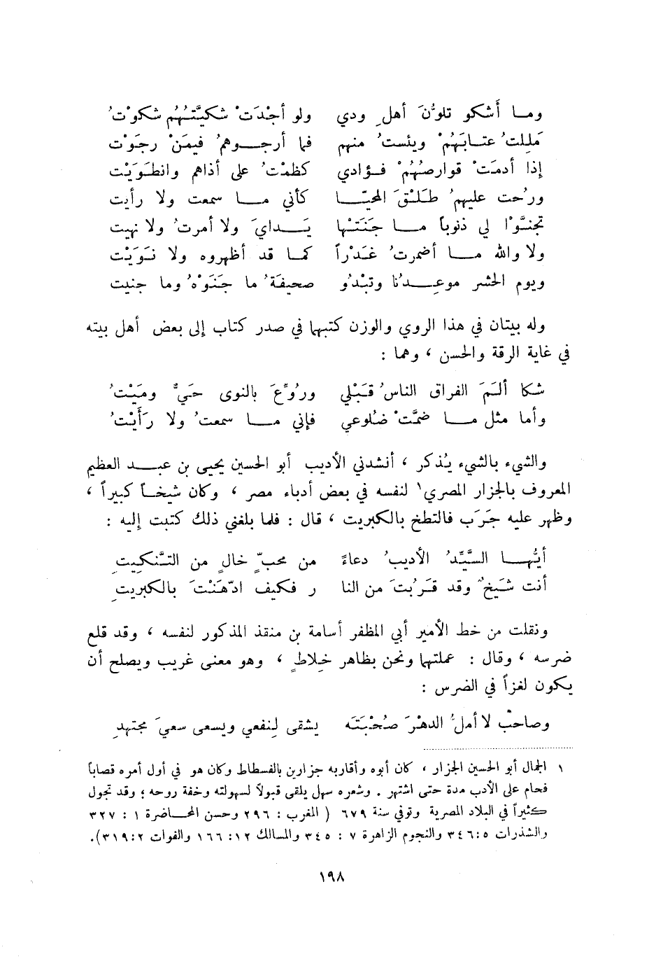 (1) الجمال أبو الحسين الجزار، كان أبوه وأقاربه جزارين بالفسطاط وكان هو في أول أمره قصاباً فحام على الأدب مدة حتى اشتهر. وشعره سهل يلقى قبولاً لسهولته وخفة روحه؛ وقد تجول كثيراً في البلاد المصرية وتوفي سنة 679 (المغرب: 296 وحسن المحاضرة 1: 327 والشذرات 5: 346 والنجوم الزاهرة 7: 345 والمسالك 12: 166 والفوات 2: 319) .