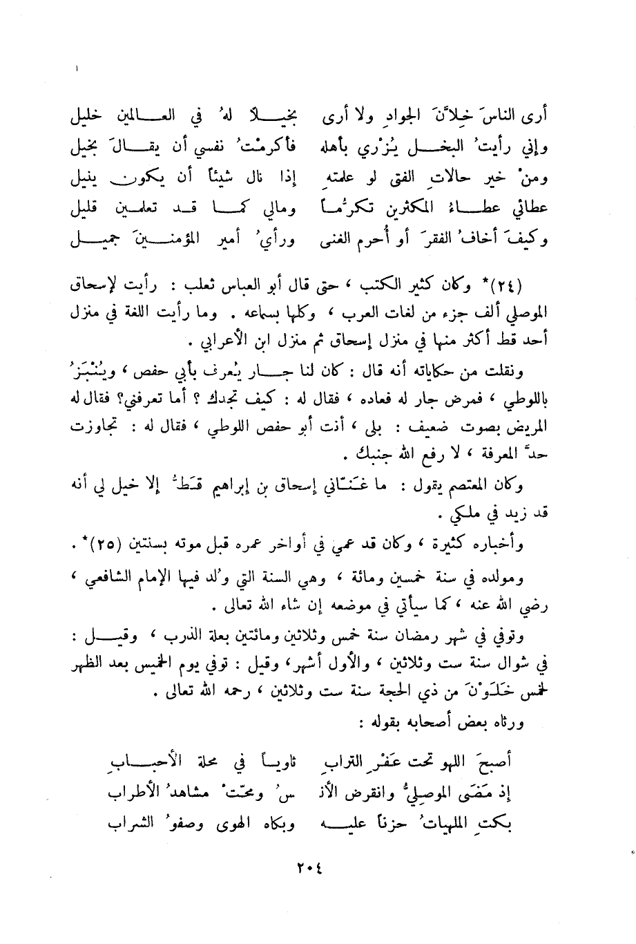 وكيف أخاف الفقر أو أحرم الغنى ... ورأي أمير المؤمنين جميل وكان كثير الكتب، حتى قال أبو العباس ثعلب: رأيت لإسحاق الموصلي ألف جزء من لغات العرب، وكلها بسماعه. وما رأيت اللغة في منزل أحد قط أكثر منها في منزل إسحاق ثم منزل ابن الأعرابي.
