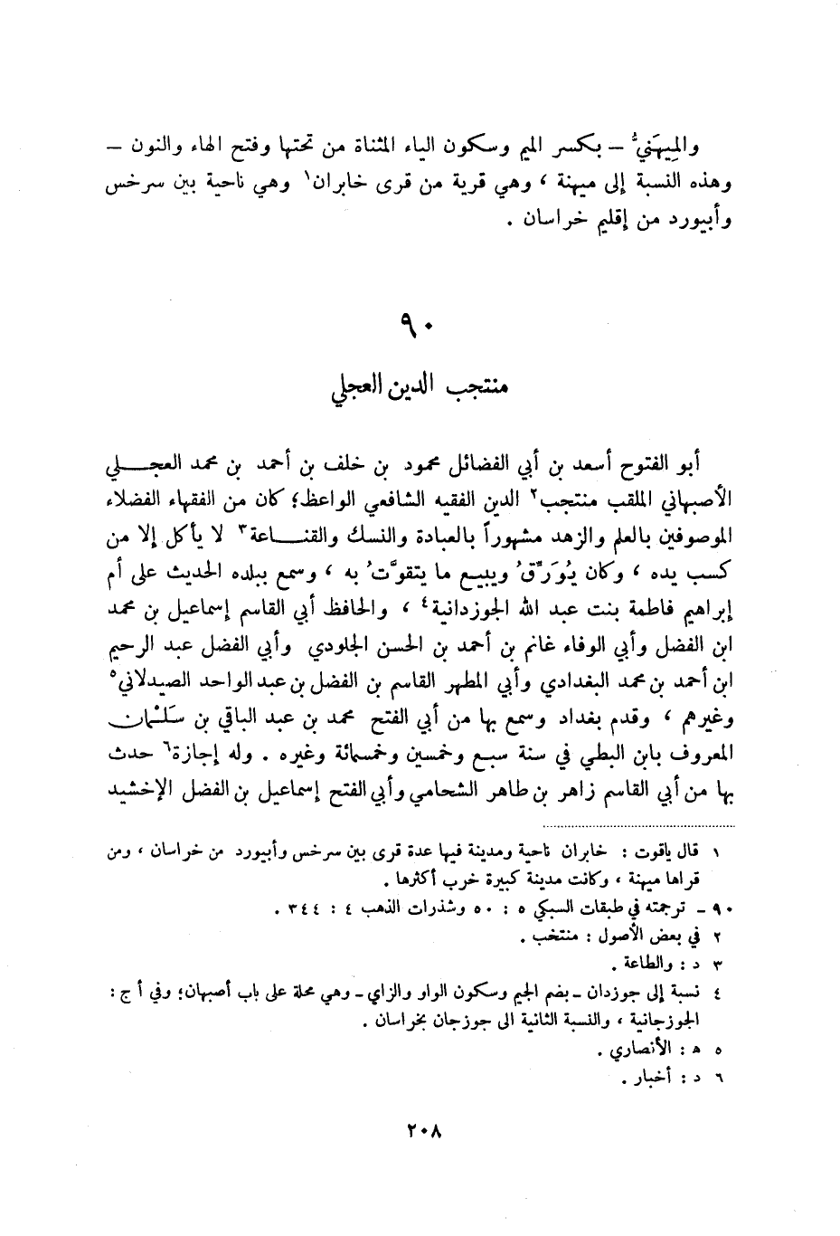 أبو الفتوح أسعد بن أبي الفضائل محمود بن خلف بن أحمد بن محمد العجلي الأصبهاني الملقب منتجب (3) الدين الفقيه الشافعي الواعظ؛ كان من الفقهاء الفضلاء الموصوفين بالعلم والزهد مشهوراً بالعبادة والنسك والقناعة (4) لا يأكل إلا من كسب يده، وكان يورق ويبيع ما يتقوت به، وسمع ببلده الحديث على أم إبراهيم فاطمة بنت عبد الله الجوزدانية (5) ، والحافظ أبي القاسم إسماعيل بن محمد ابن الفضل وأبي الوفاء غانم بن أحمد بن الحسن الجلودي وأبي الفضل عبد الرحيم ابن أحمد بن محمد البغدادي وأبي المطهر القاسم بن الفضل بن عبد الواحد الصيدلاني (6) وغيرهم، وقدم بغداد وسمع بها من ابي الفتح محمد بن عبد الباقي بن سلمان المعروف بابن البطي في سنة سبع وخمسين وخمسمائة وغيره. وله إجازة (7) حدث بها من أبي القاسم زاهر بن طاهر الشحامي وأبي الفتح إسماعيل بن الفضل الإخشيد
