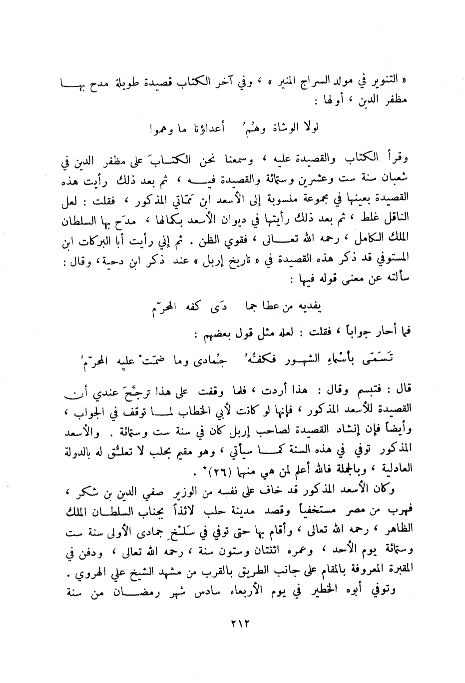 تسمى بأسماء الشهور فكفه ... جمادى وما ضمت عليه المحرم قال: فتبسم وقال: هذا أردت، فلما وقفت على هذا ترجح عندي أن القصيدة للأسعد المذكور، فإنها لو كانت لأبي الخطاب لما توقف في الجواب، وأيضاً فإن إنشاد القصيدة لصاحب إربل كان في سنة ست وستمائة. والأسعد المذكور توفي في هذه السنة كما سيأتي، وهو مقيم بحلب لاتعلق له بالدولة العادلية، وبالجملة فالله أعلم لمن هي منهما (26) .