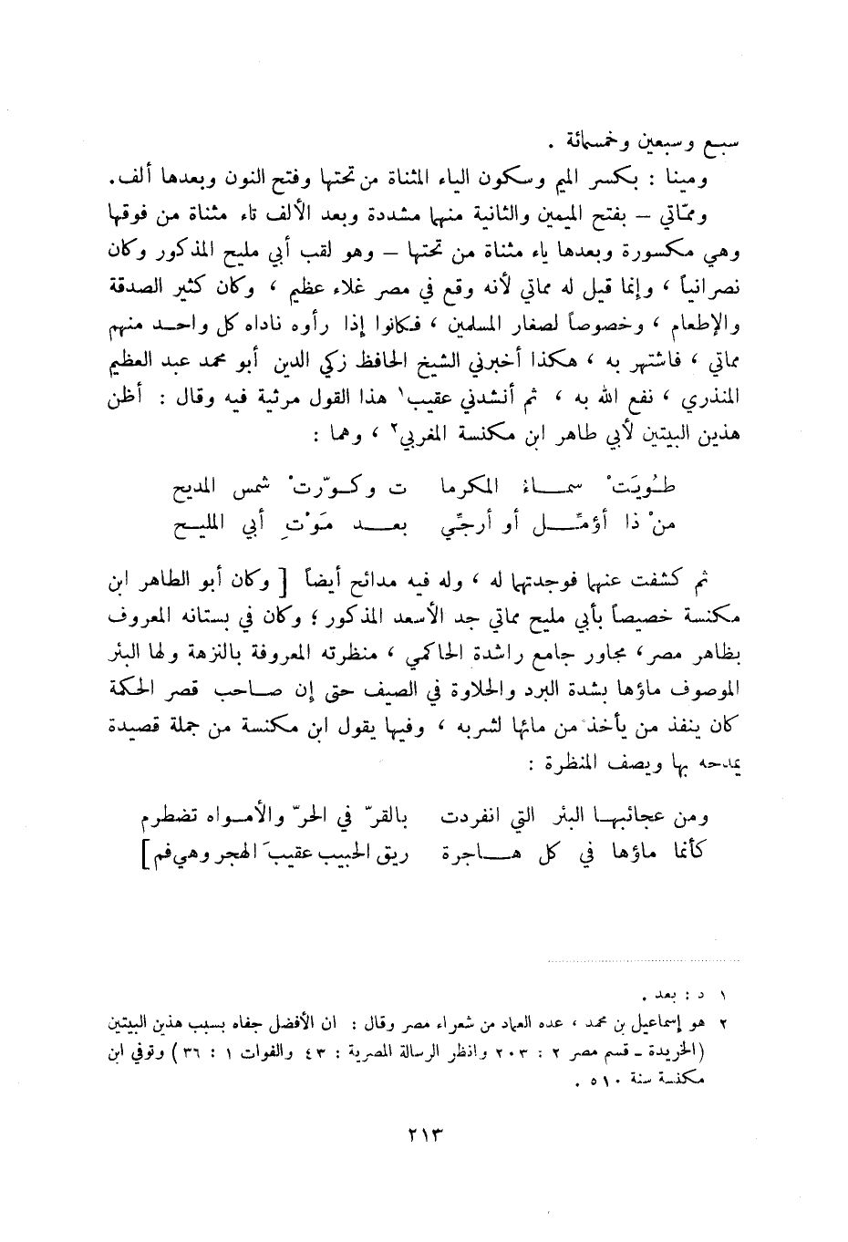 (2) هو إسماعيل بن محمد، عده العماد من شعراء مصر وقال: إن الأفضل جفاه بسبب هذين البيتين (الخريدة - قسم مصر 2: 203 وانظر الرسالة المصرية: 43 والفوات 1: 36) وتوفي ابن مكنسة سنة 510.