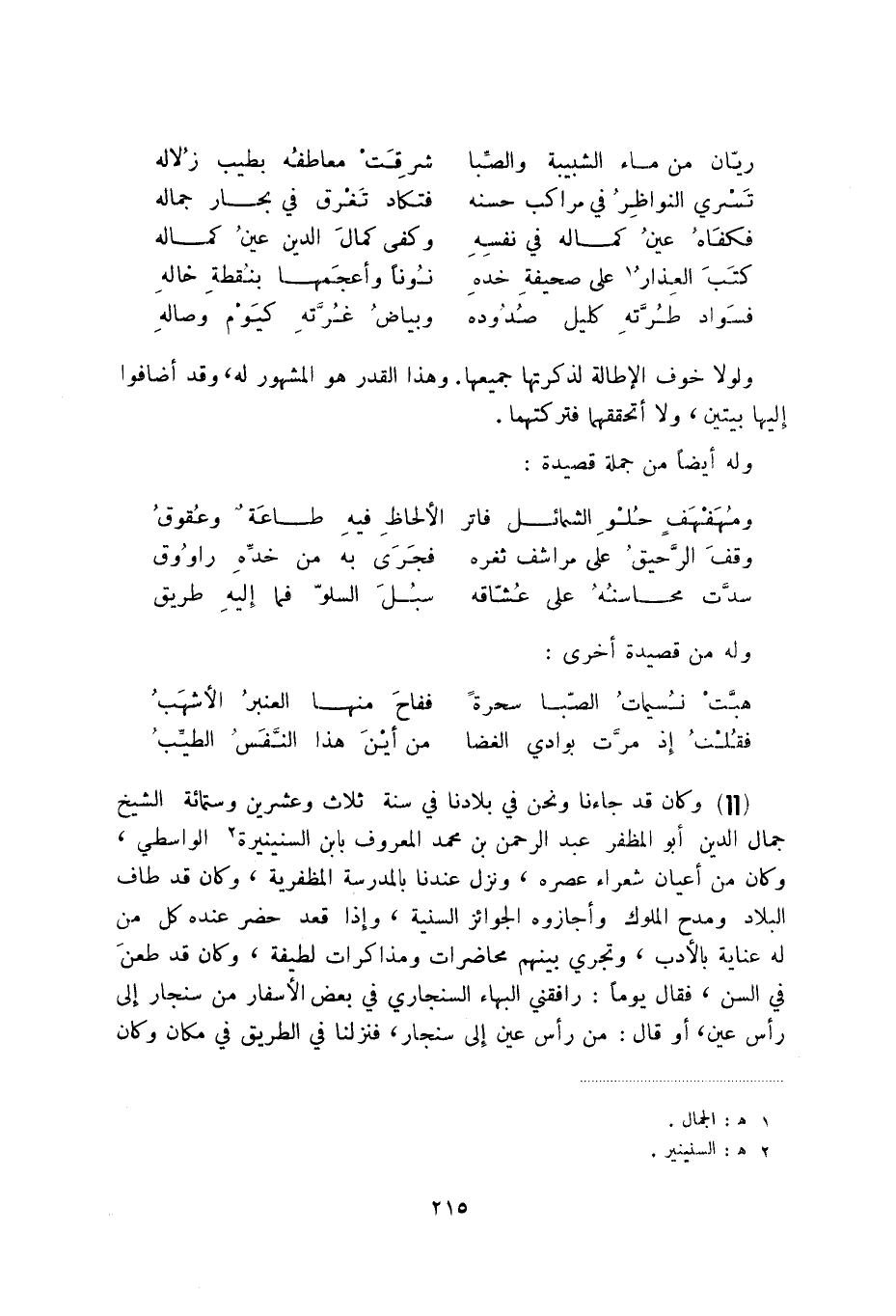 فقلت إذ مرت بوادي الغضا ... من أين هذا النفس الطيب (11) وكان قد جاءنا ونحن في بلادنا في سنة ثلاث وعشرين وستمائة الشيخ جمال الدين أبو المظفر عبد الرحمن بن محمد المعروف بابن السنينيرة (2) الواسطي، وكان من أعيان شعراء عصره، ونزل عندنا بالمدرسة المظفرية، وكان قد طاف البلاد ومدح الملوك وأجازوه الجوائز السنية، وإذا قعد حضر عنده كل من له عناية بالأدب، وتجري بينهم محاضرات ومذكرات لطيفة، وكان قد طعن في السن، فقال يوماً: رافقني البهاء السنجاري في بعض الأسفار من سنجار إلى رأس عين، أو قال: من رأس عين إلى سنجار، فنزلنا في الطريق في مكان وكان
