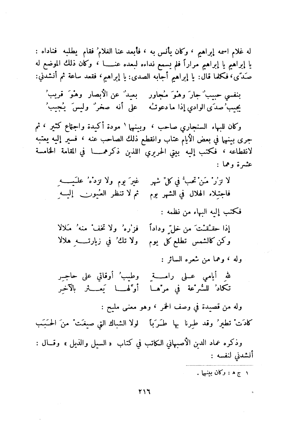 يجيب صدى الوادي إذا ما دعوته ... على أنه صخر وليس يجيب وكان للبهاء السنجاري صاحب، وبينهما (1) مودة أكيدة واجتماع كثير، ثم جرى بينهما في بعض الأيام عتاب وانقطع ذلك الصاحب عنه، فسير إليه يعتبه لانقطاعه، فكتب إليه بيتي الحريري اللذين ذكرهما في المقامة الخامسة عشرة وهما: