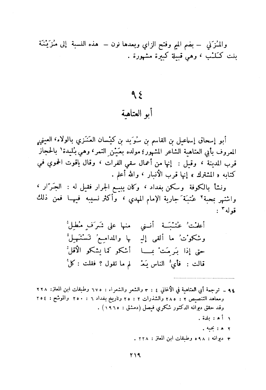 (1) ترجمة أبي العتاهية في الأغاني 4: 3 والشعر والشعراء: 675 وطبقات ابن المعتز: 228 ومعاهد التنصيص 2: 285 والشذرات 2: 25 وتاريخ بغداد 6: 250 والموشح: 254 وقد حقق ديوانه الدكتور شكري فيصل (دمشق: 1965) .
